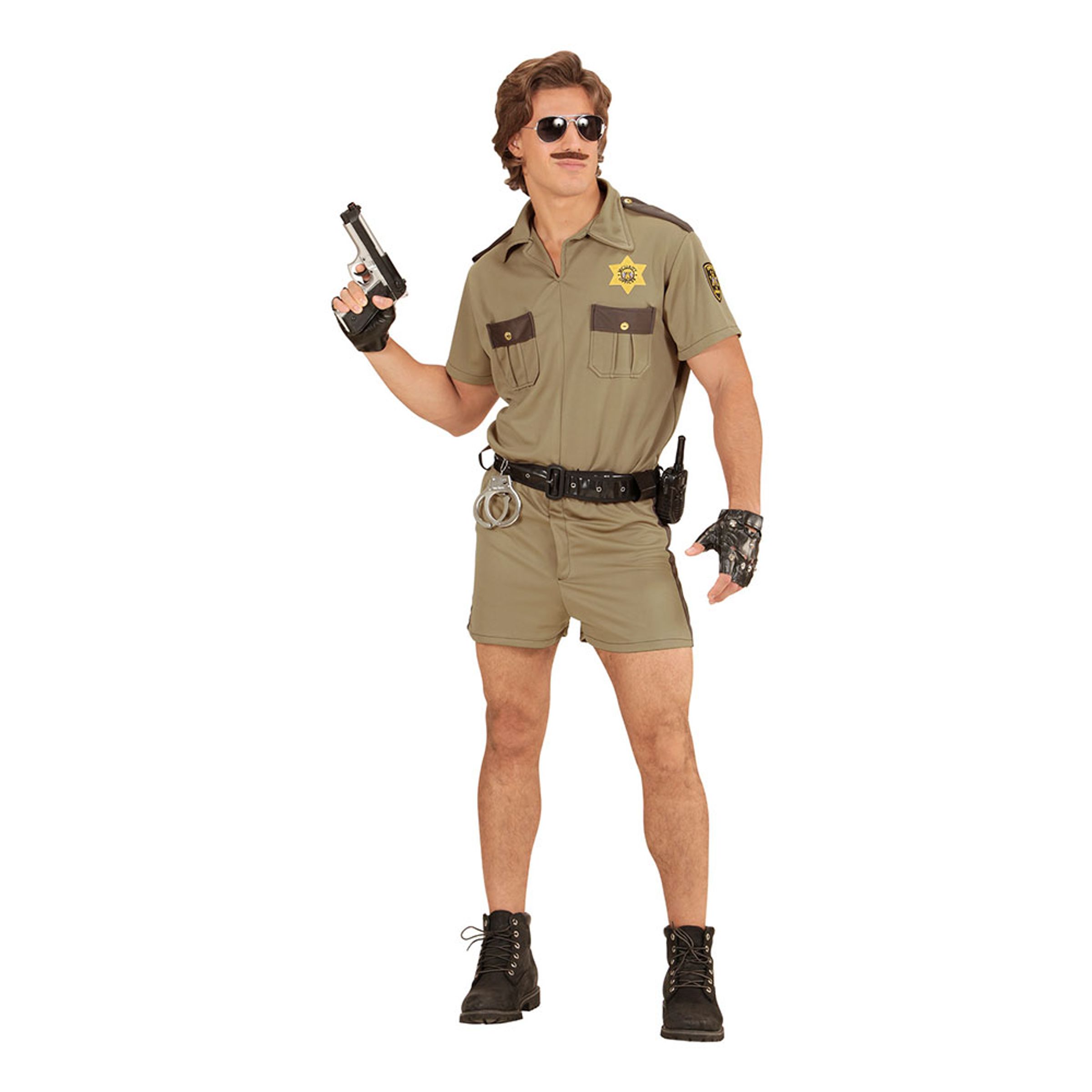 Kalifornisk Trafikpolis Maskeraddräkt inkluderar en beige polisskjorta med sheriffstjärna, bruna axellappar och bröstfickor samt ett par matchande shorts. Ingår gör även ett svart bälte.