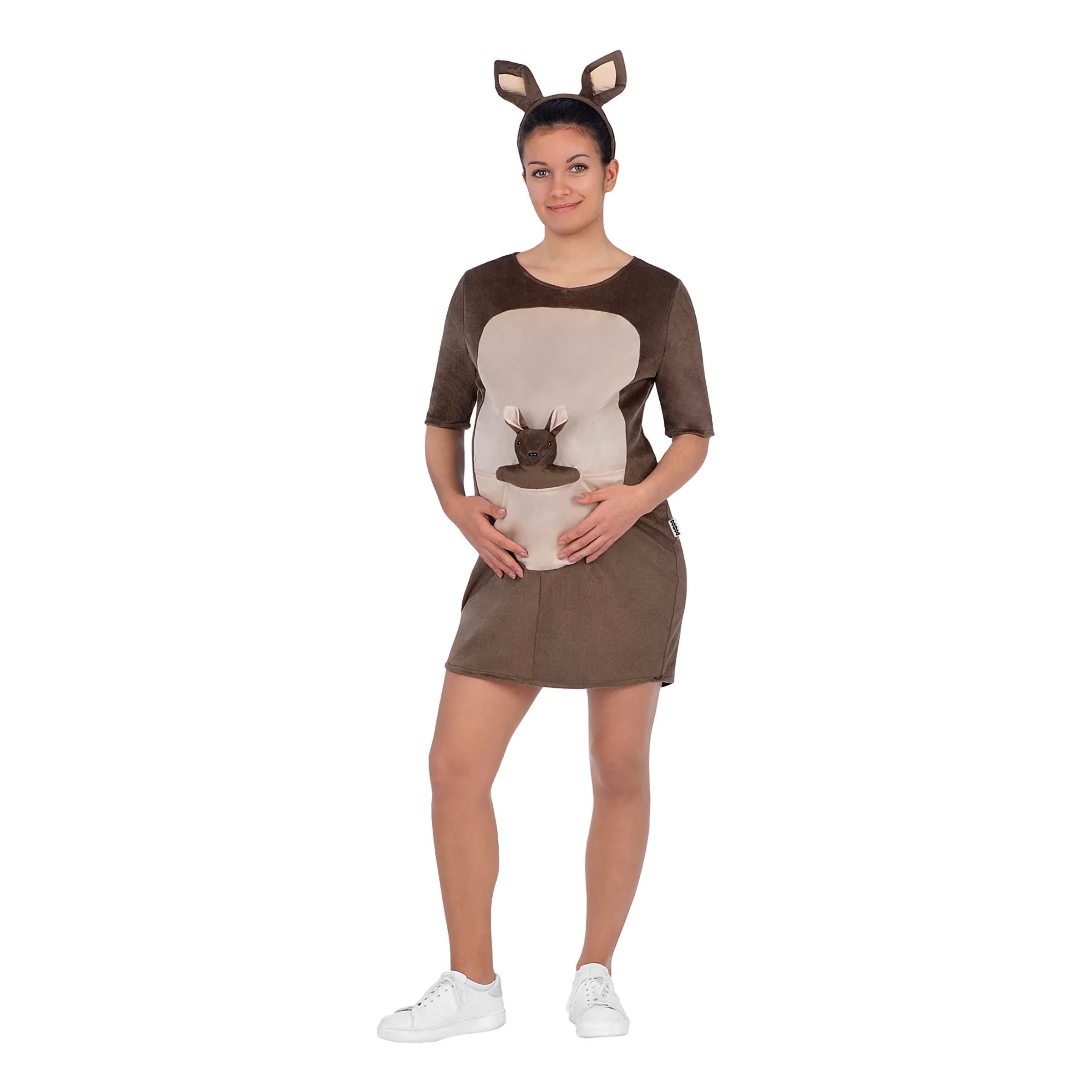 Känguru Mamma Maskeraddräkt för Gravid inkluderar en brun klänning och ett diadem med känguruöron. Framtill finns en ficka med ett litet gosedjur i form av en känguru-bebis. En helkul maskeraddräkt för dig som är gravid och ska på maskerad!