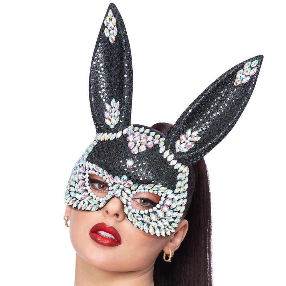 Kanin Halvmask omfattar en svart halvmask med två kaninöron. Masken är dekorerad med holografiska diamanter och hålls på plats med ett svart elastiskt band.