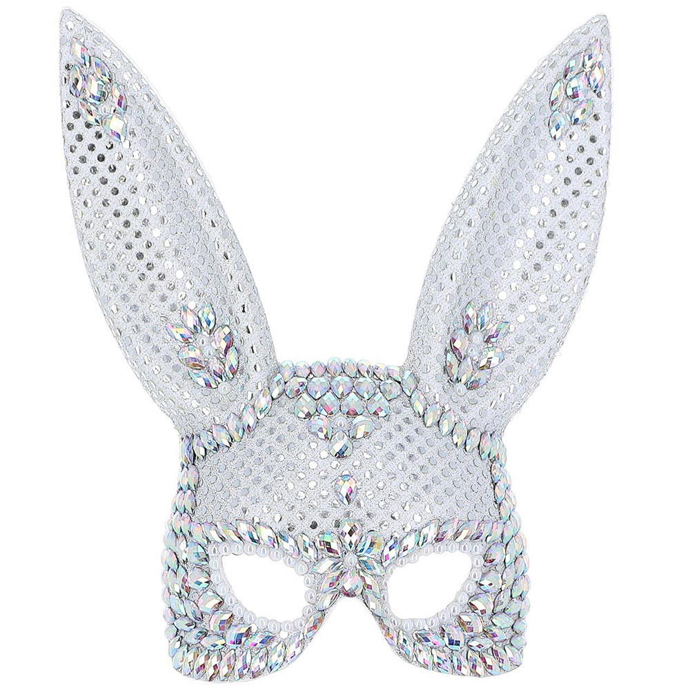 Kanin Mask med Juveler omfattar en vit kaninmask i ett hårt material täckt med silverdetaljer och plastjuveler. Hålls på plats med resårband.