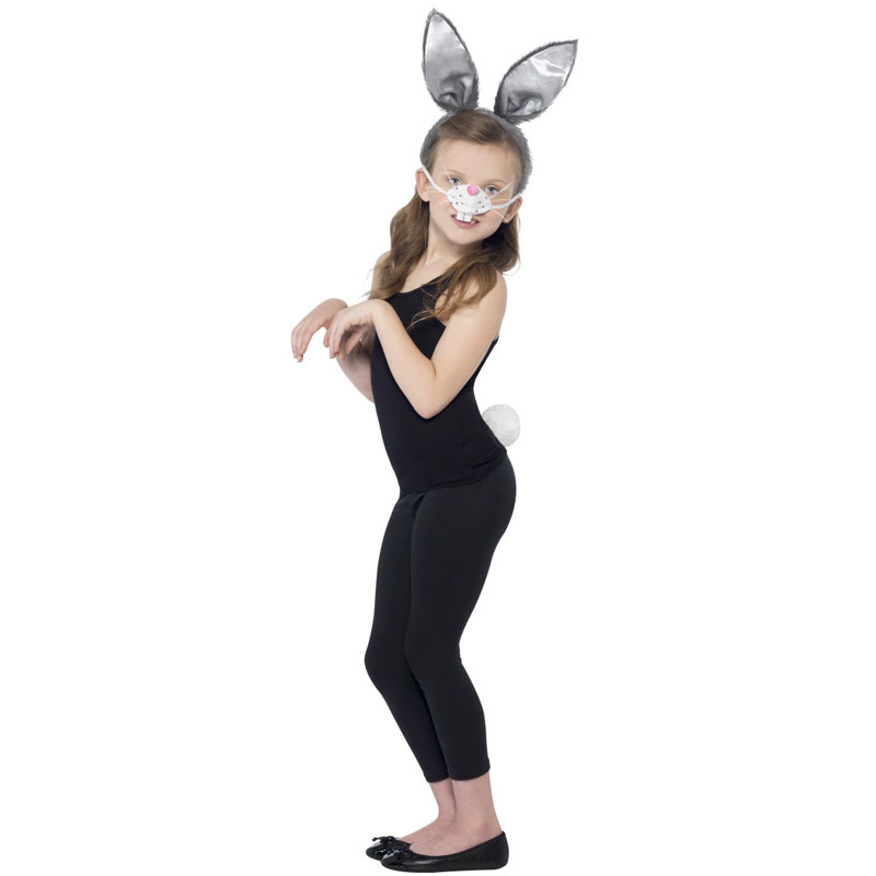 Kanin Tillbehörskit inkluderar ett grått diadem med utstickande öron, samt en rosa nos med både kanintänder och morrhår som enkelt fästs runt huvudet med hjälp av ett elastiskt band. Det ingår dessutom en vit tuss för den kompletta kanin-looken.