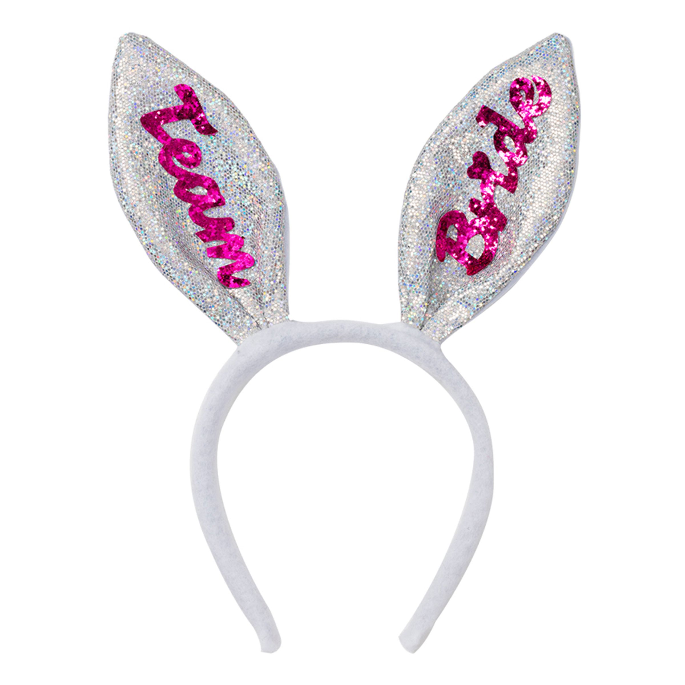 Kanindiadem Team Bride är ett klassiskt diadem med kaninöron på toppen. På det enda örat står det "team" och på det andra står det "bride" så att att alla ska veta att ni är på brudens sida i äktenskapet.