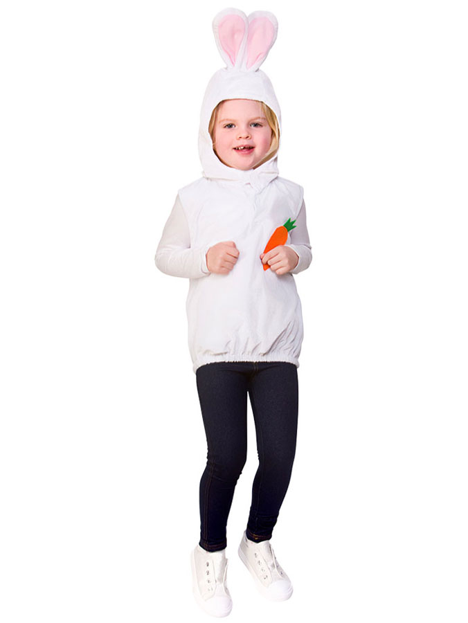 Kanindräkt med Luva Barn består av en vit väst med luva med öron. Västen är även dekorerad med en söt kaninsvans och en morot.