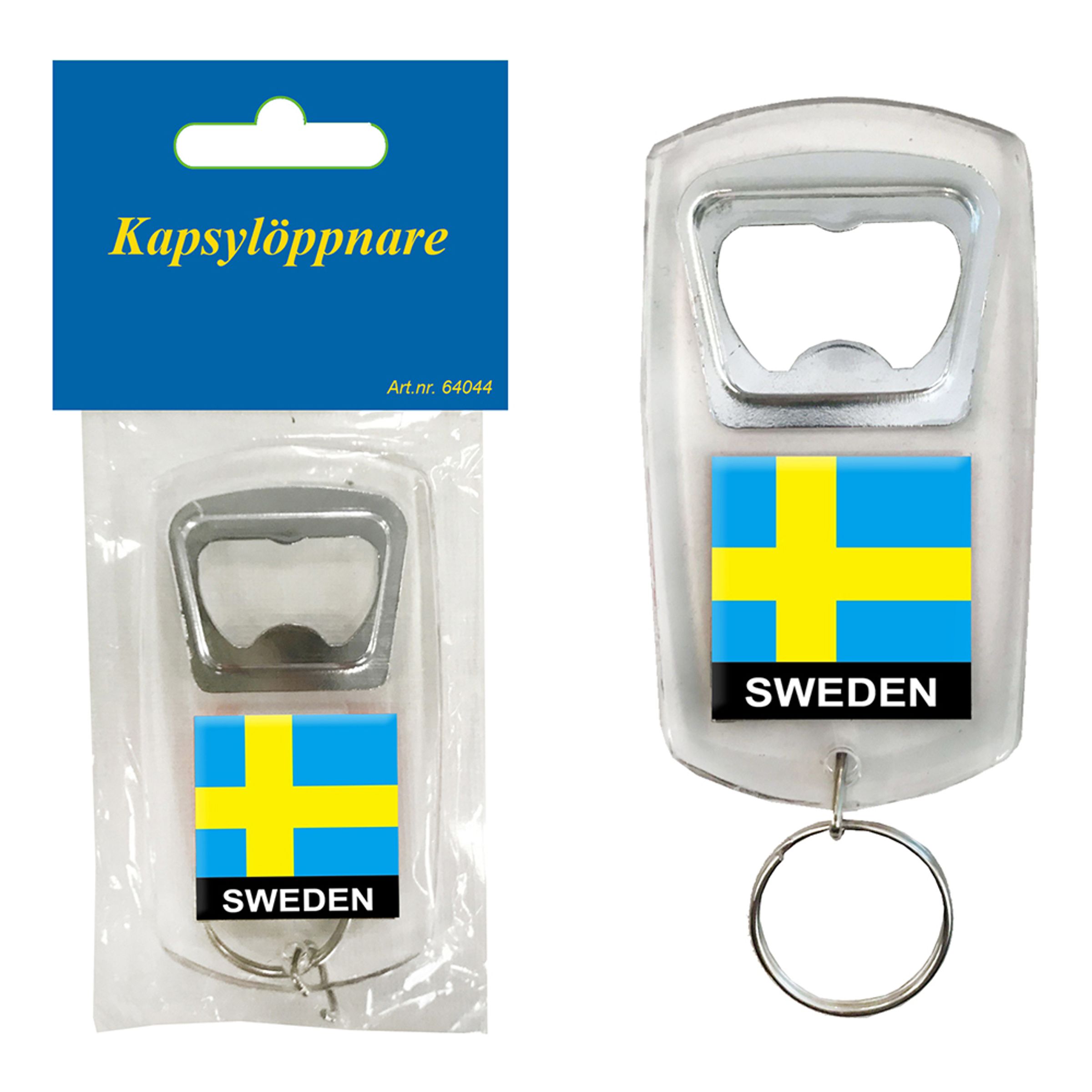 Kapsylöppnare på Nyckelring Sverige är en kapsylöppnare med motiv föreställande svenska flaggan i blått och gult och texten "Sweden". Säljs styckvis. Tillverkad av plast och metall. Mäter ca 4,5 x 8,5 cm.