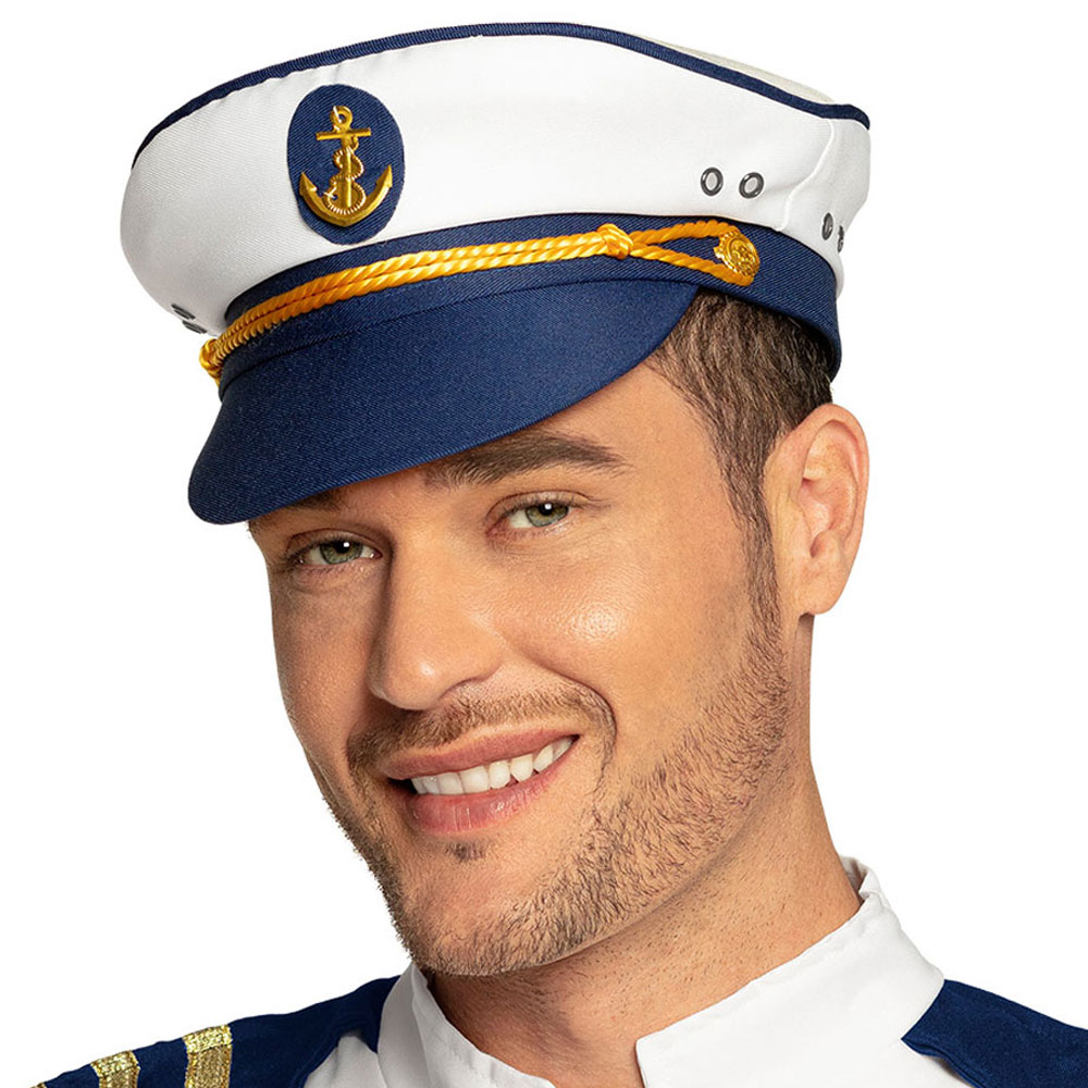 Kaptenshatt med Guld Ankare består av en vit kaptenshatt med mörkblå skärm och detaljer samt ankare och band i guld framtill.