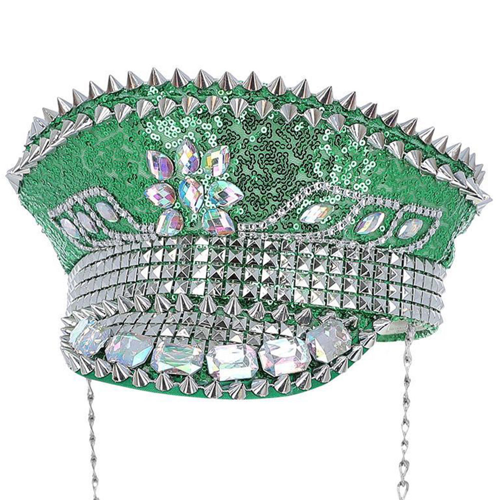 Kaptenshatt Paljetter och Nitar Grön omfattar en kapten hatt med gröna paljetter, nitar i silverfärgad plast, regnbågsskimrande strass i plast samt en lång kedja.
