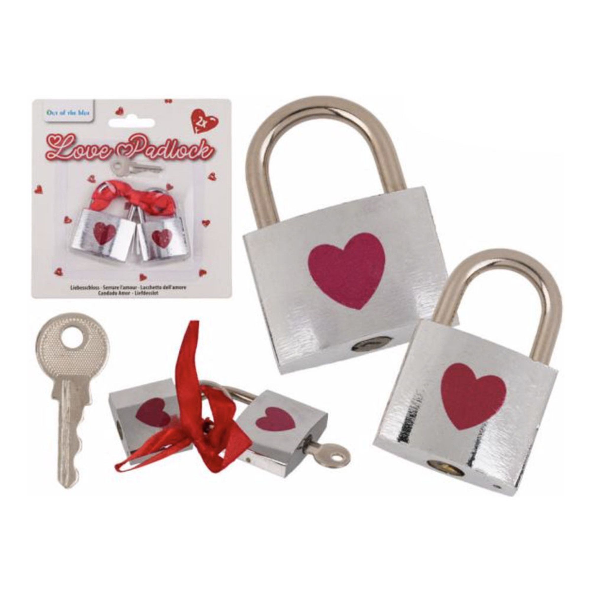Kärlekshänglås inkluderar två stycken hänglås och en nyckel i metall. Låsen mäter: 3 x 4,7 och 3,5 x 5 cm.