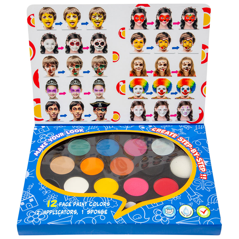 Karneval Ansiktsmålning Kit omfattar ett ansiktsmålnings kit med tolv stycken ansiktsfärger och tillbehör för att göra olika ansiktsmålningar. Färgerna som medföljer är: grön, blå, lila, grå, beige, orange, brun, svart, vit, gul, rosa och röd. Instruktioner och exempel för ansiktsmålning medföljer på förpackningen.