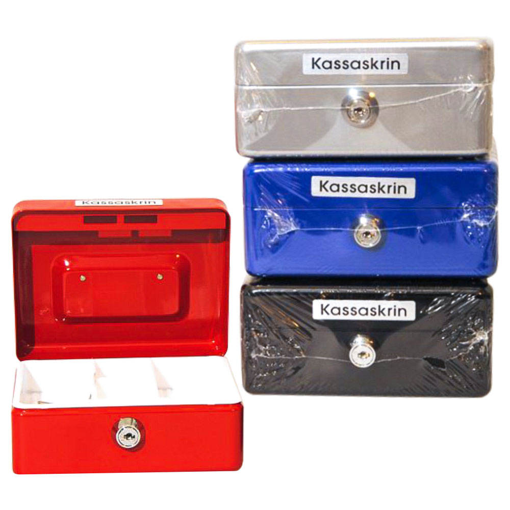 Kassaskrin innehåller ett litet kassaskrin av metall med mynthållare och nyckellås.