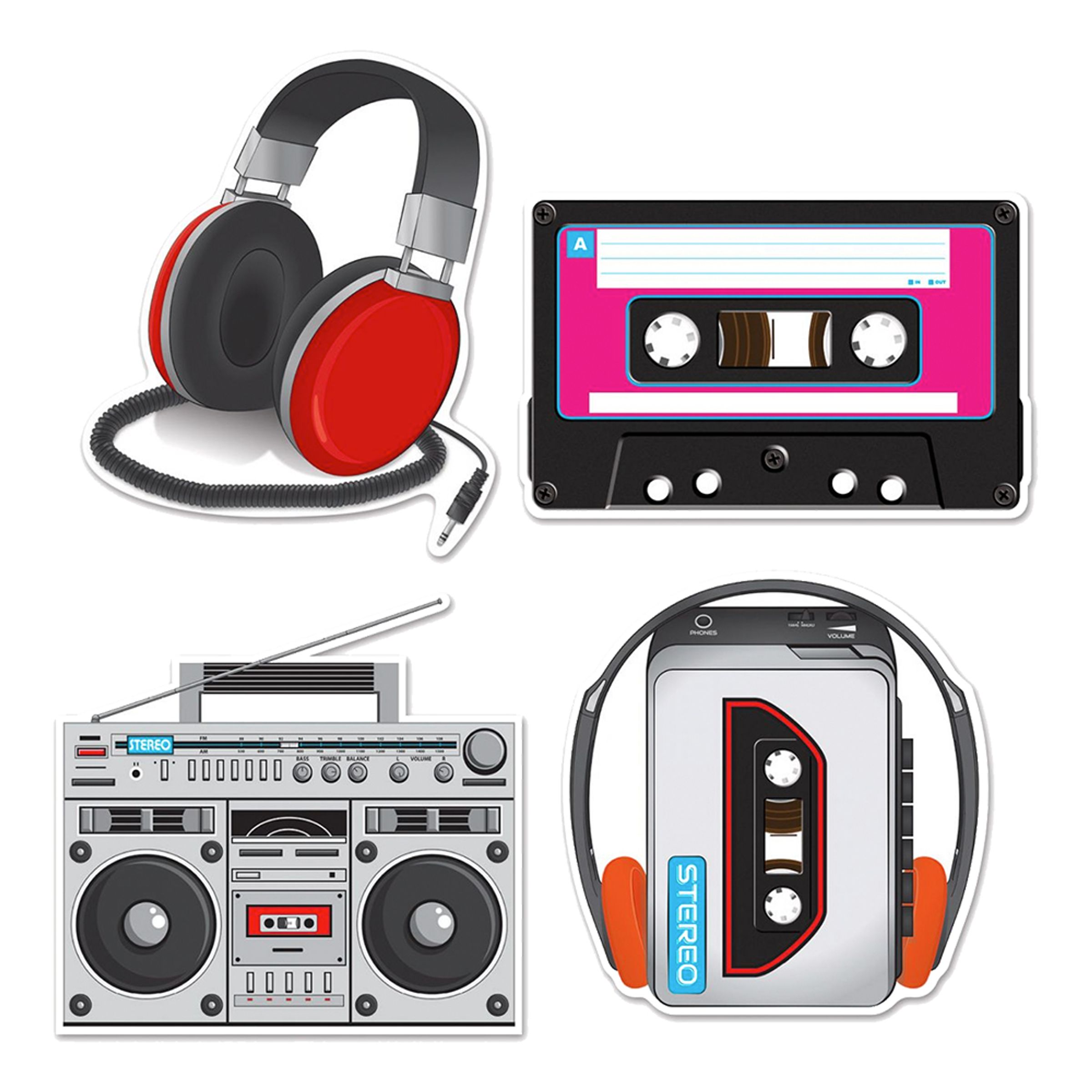 Kassettband Foto Props inkluderar fyra stycken dekorationer i papp. Motiven på dekorationerna är ett kassettband, en bergsprängare, ett par hörlurar och en kassettspelare. De är mellan 30 och 35 cm stora.
