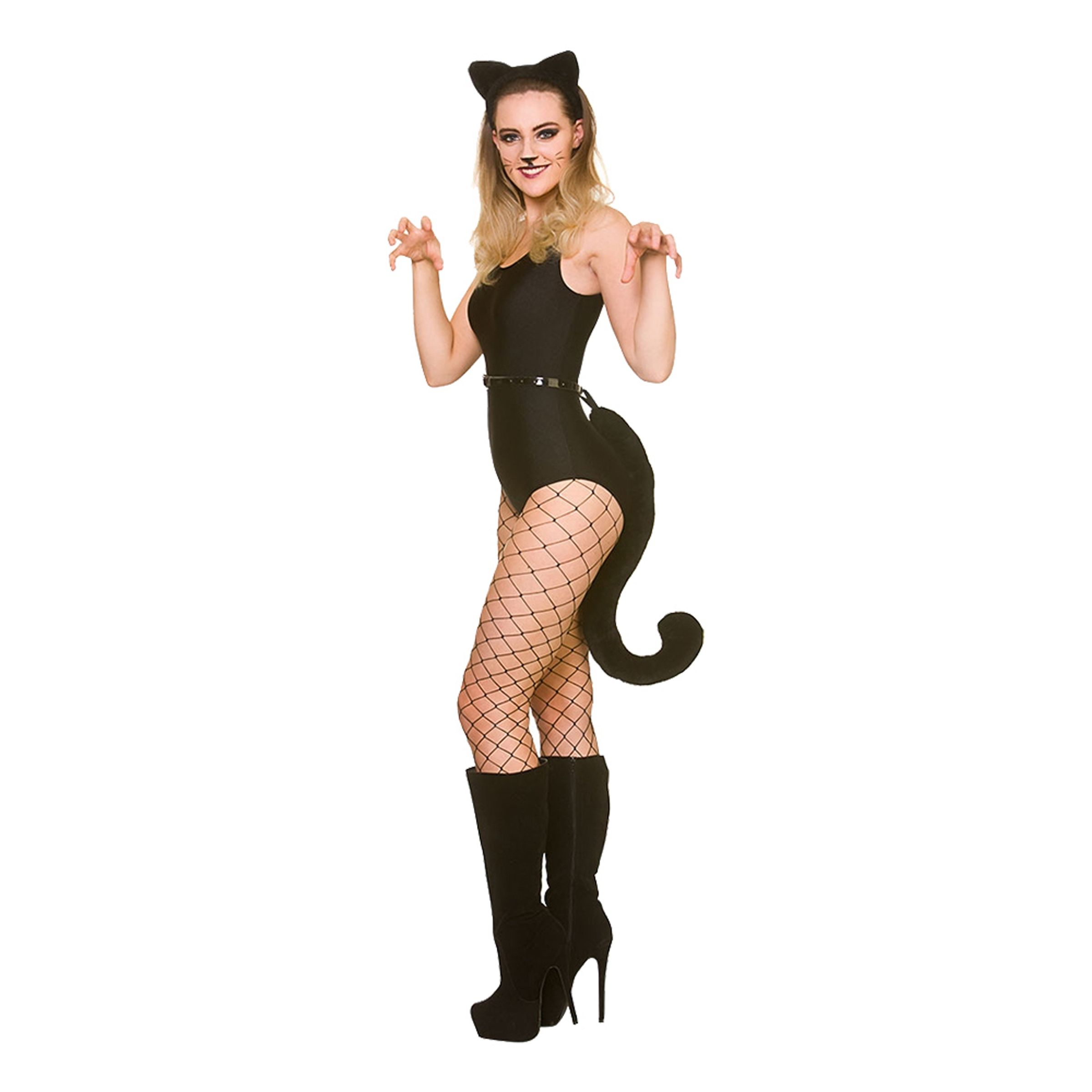 Katt Svart Tillbehörskit består av ett diadem med svarta kattöron och en lurvig, svart kattsvans. Svansen går att fästa på ett skärp (ingår ej).