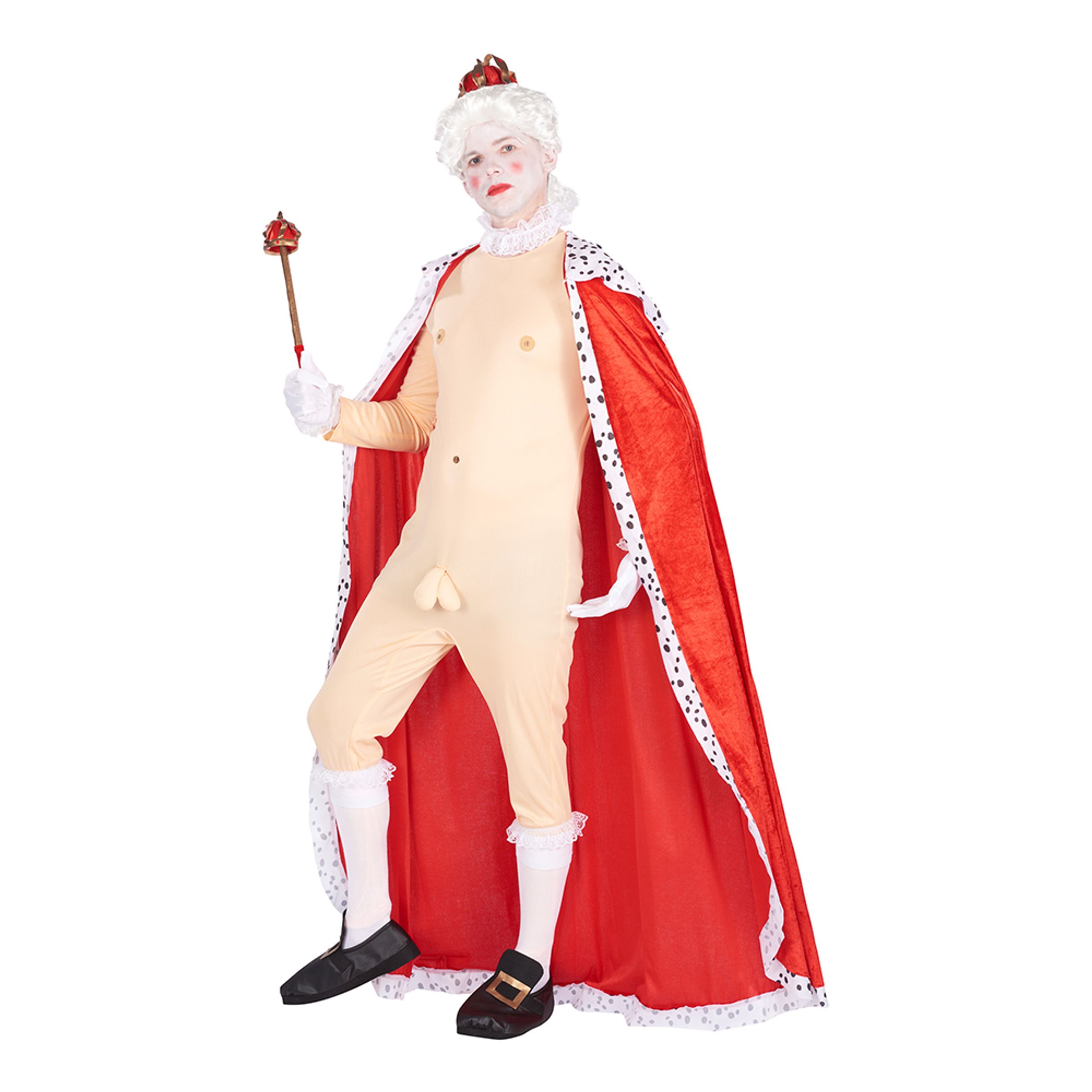 Kejsarens Nya Kläder Maskeraddräkt inkluderar en ljusbeige body med manligt könsorgan och fastsydd lång cape i röd färg. Ingår gör även ett par vita strumpeband, skoöverdrag och en vit spetskrage. Peruk, handskar, smink, strumpor, krona och stav ingår ej.