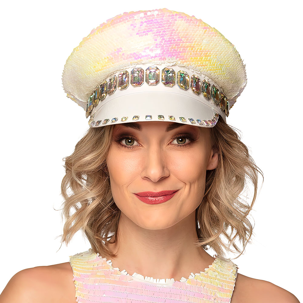 Keps Iridescent med Stenar omfattar en keps med pärlemorskimrande paljetter och vackra stenar.