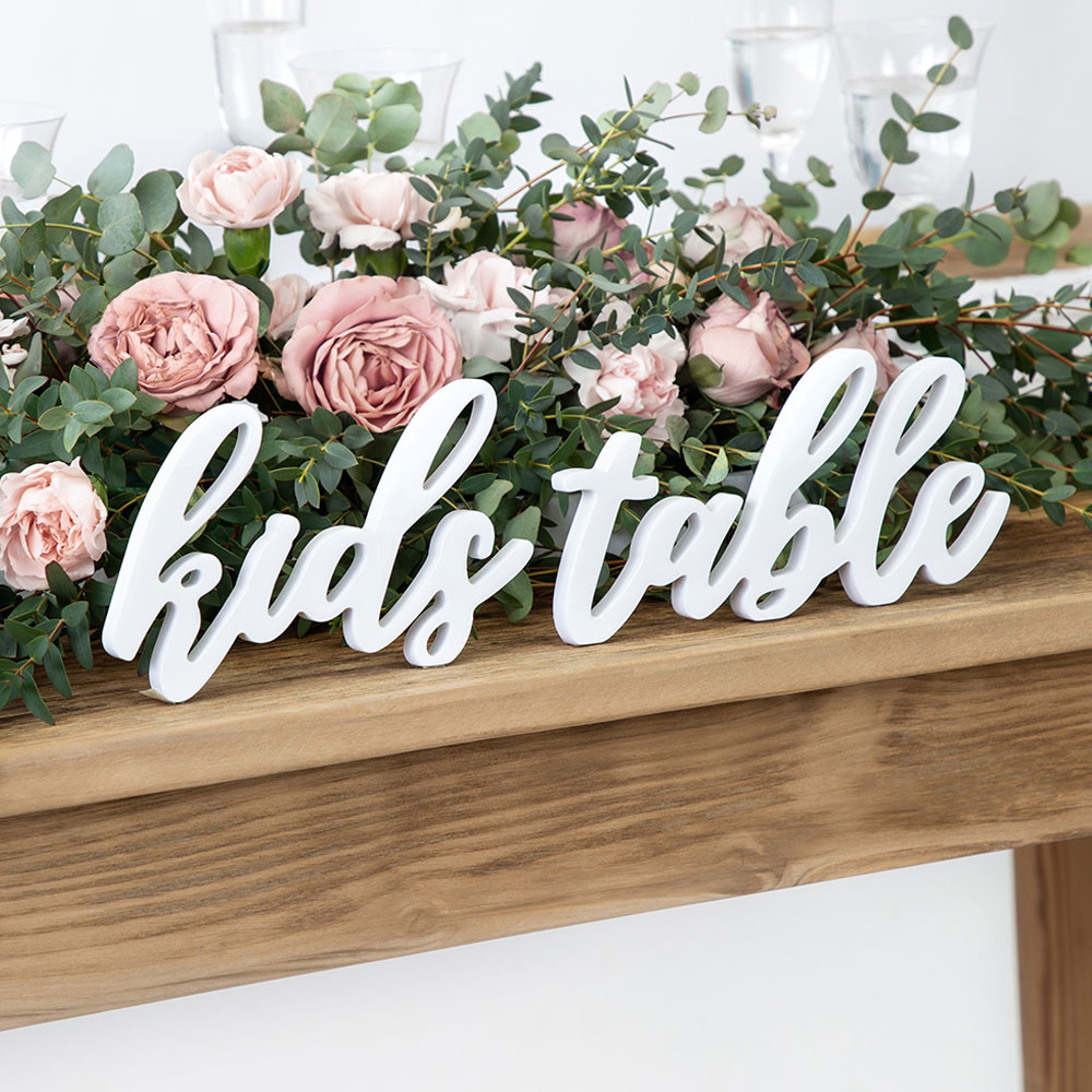 Låt de allra yngsta bröllopsgästerna sitta vid ett eget kalasbord under firandet och märk ut det snyggt med denna fina Kids Table träskylt! Den blir en riktigt snygg dekoration samtidigt som den enkelt visar var barnen ska sitta. Superfin bröllopsdekoration som passar perfekt för dig som söker en stämningshöjande dekoration till ett bröllop med barnbord.