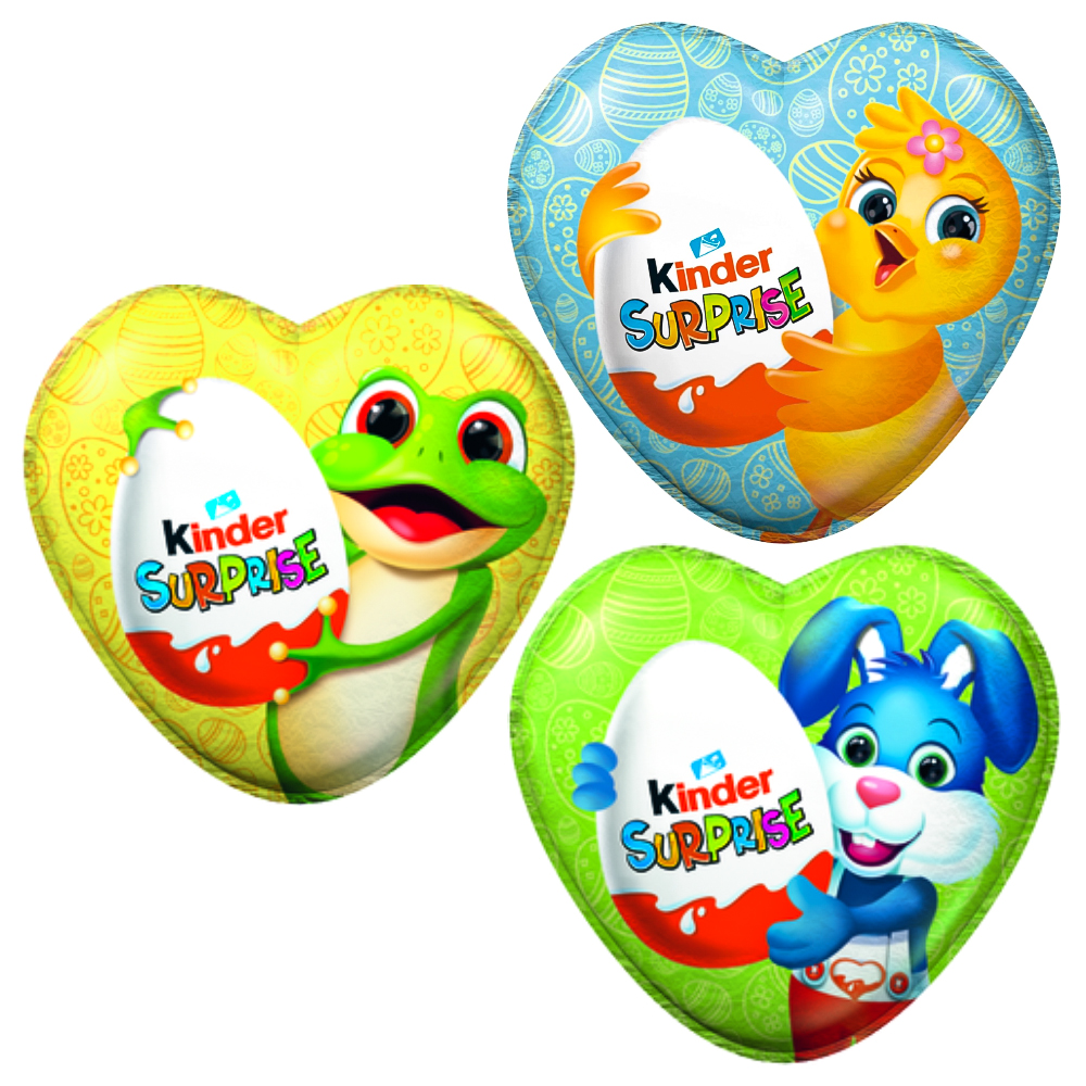 Kinderägg Surprise Hjärta består av ett chokladhjärta med kinderägg surprise i. Hjärtat mäter ungefär 9 centimeter i längd och 10 i bredd, det har en vikt på 54 gram. Finns i olika utföranden, vilken du får blir en överraskning. Säljs styckvis. Ej lämplig för barn under 3 år pga kvävningsrisk.