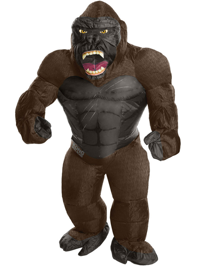 King Kong Uppblåsbar Gorilla Dräkt är en helkroppsdräkt som går att blåsa upp. Dräkten är mörk med små detaljer och ett argt gorilla ansikte.