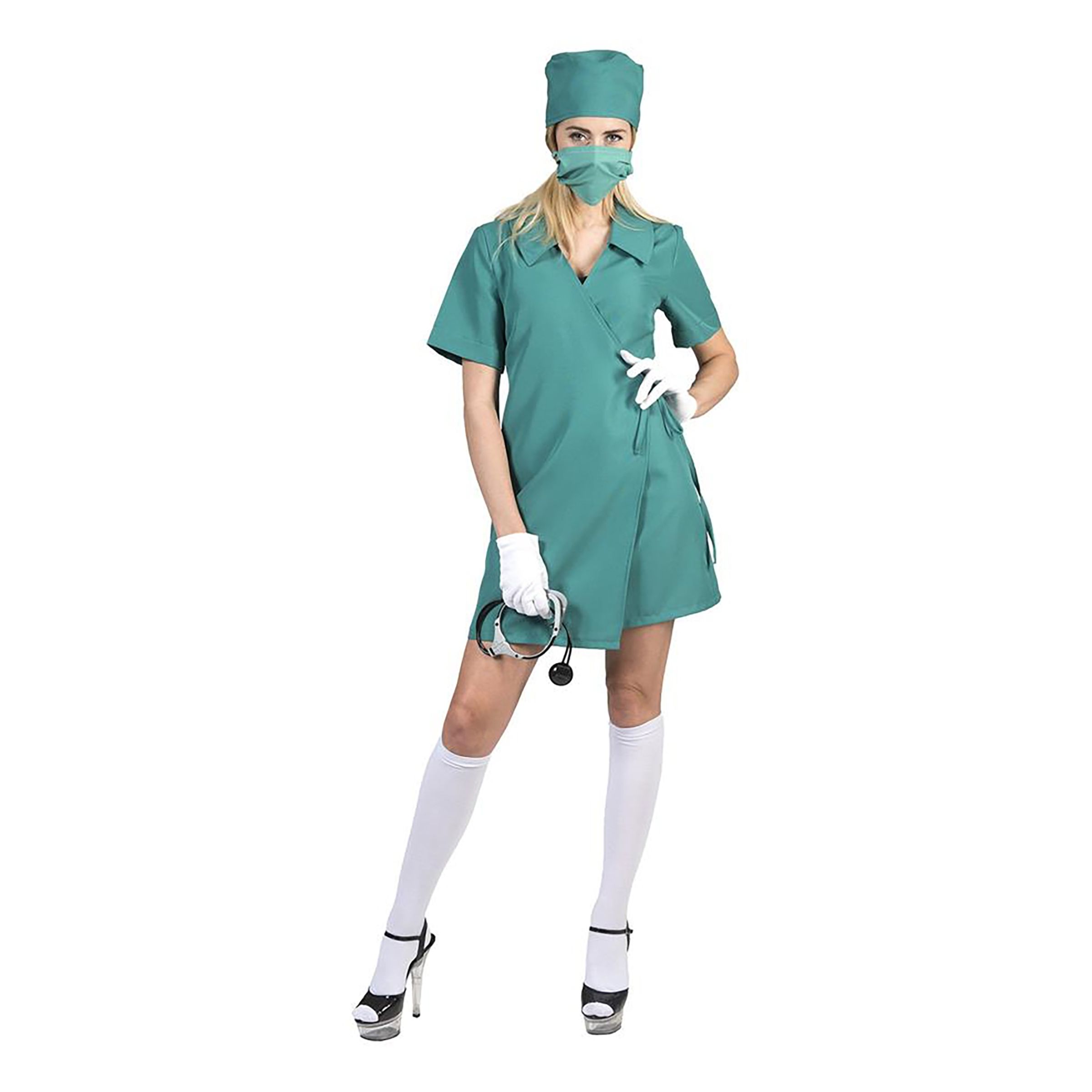 Kirurg Klänning Maskeraddräkt består en grön klänning  designad som en klassisk "scrub", det vill säga de dräkter som sjuksköterskor har. Komplettera gärna med ett stetoskop, vita strumpor och handskar för en fullbordad outfit.