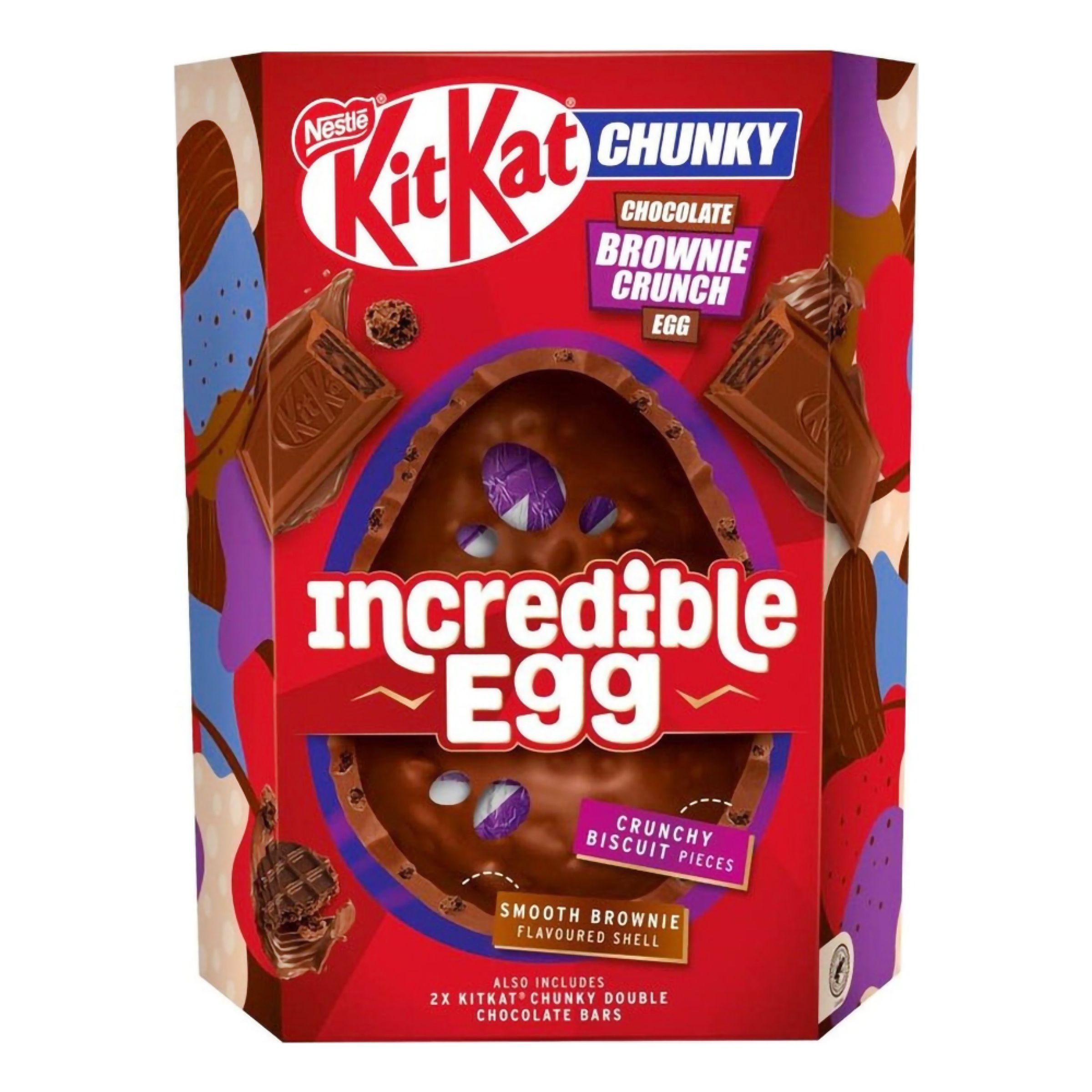 KitKat Chunky Crunchy Brownie Chocolate Incredible Egg är ett gigantiskt chokladägg/påskägg som kommer med browniesmakande mjölkchokladskal fullt av krispiga kakao-kexbitar. I förpackningen ingår även två KitKat Chunky Double Chocolate-kakor.