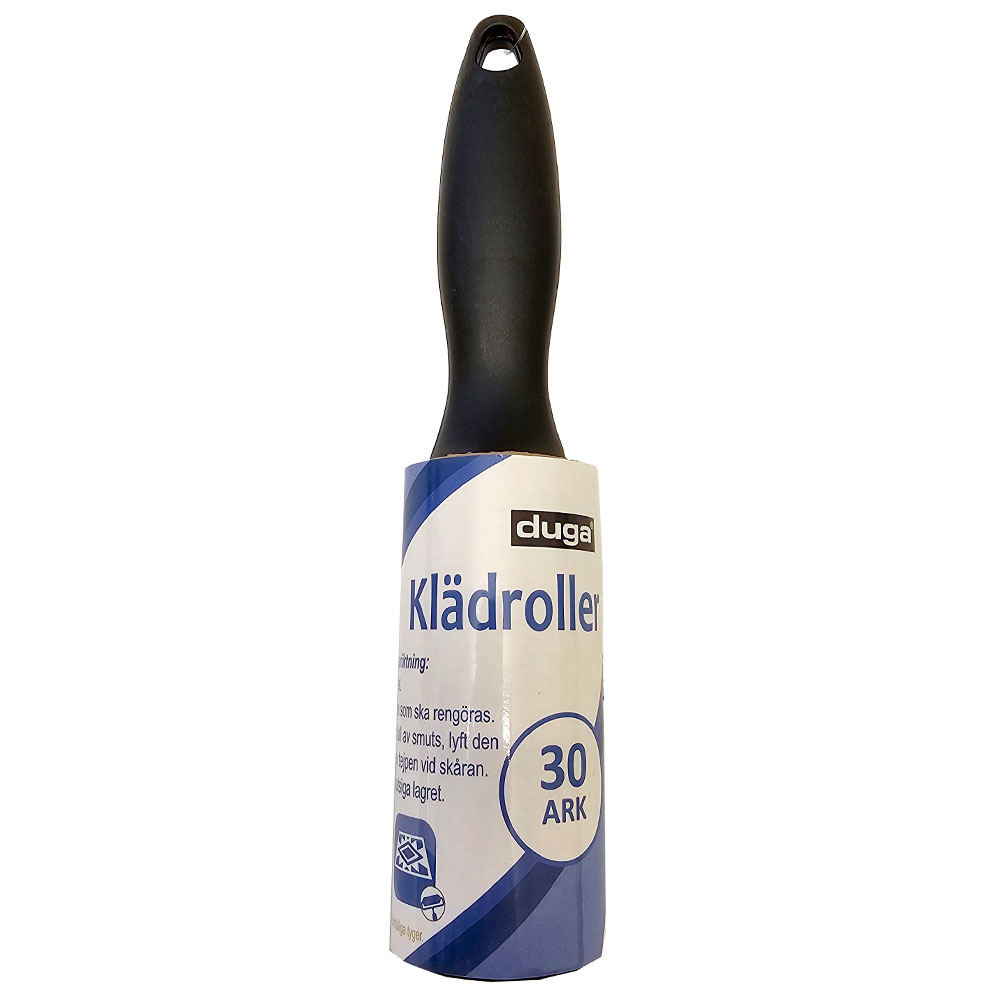 Klädroller med Plasthandtag omfattar en roller för att rengöra kläder från ludd, damm, mjäll och hår. Klädrollern består av 30 ark och har ett plasthandtag på 12 cm.