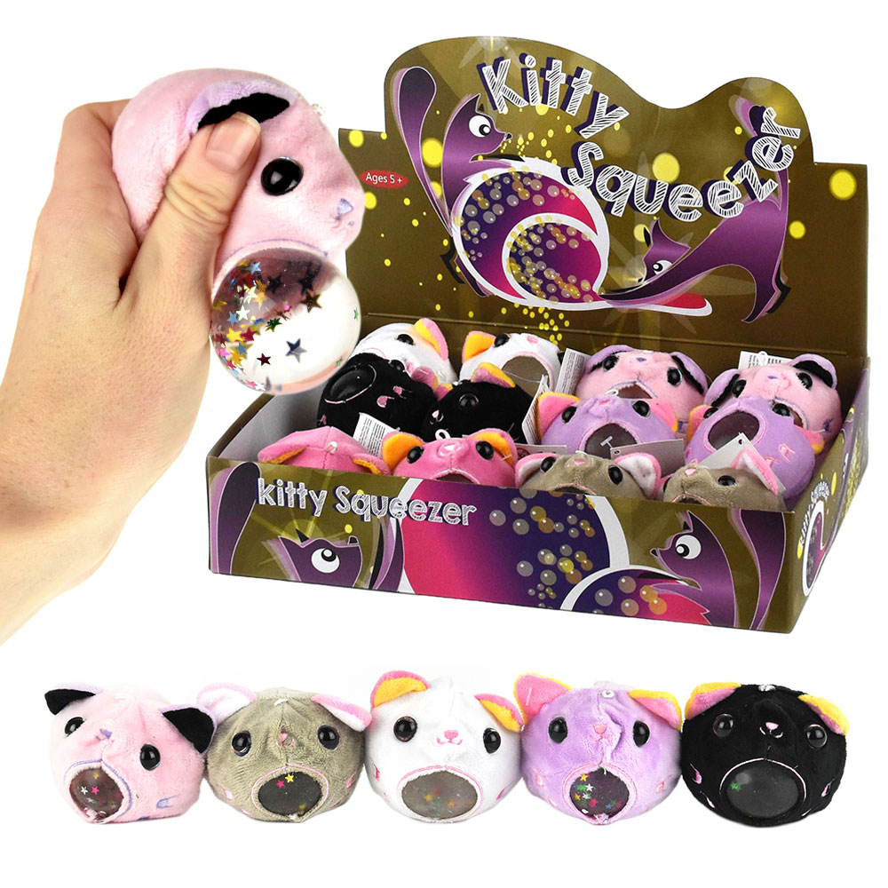 Klämkatt Stressboll är en liten klämboll klädd i tyg som liknar en liten katt med ett hål på magen. Kläm på katten så tittar magen ut som är fylld med stjärnglitter. Finns i sex olika färger, vilken du får slumpas.