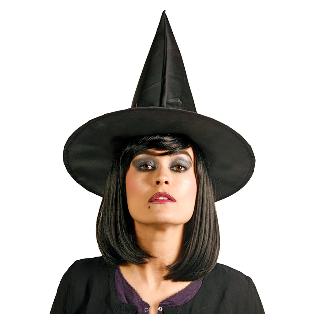 Klassisk Häxhatt Svart omfattar en svart, klassisk häxhatt av polyester som är ca 34 cm hög. Hatten mäter ca 58,5 cm i omkrets och passar vuxna.