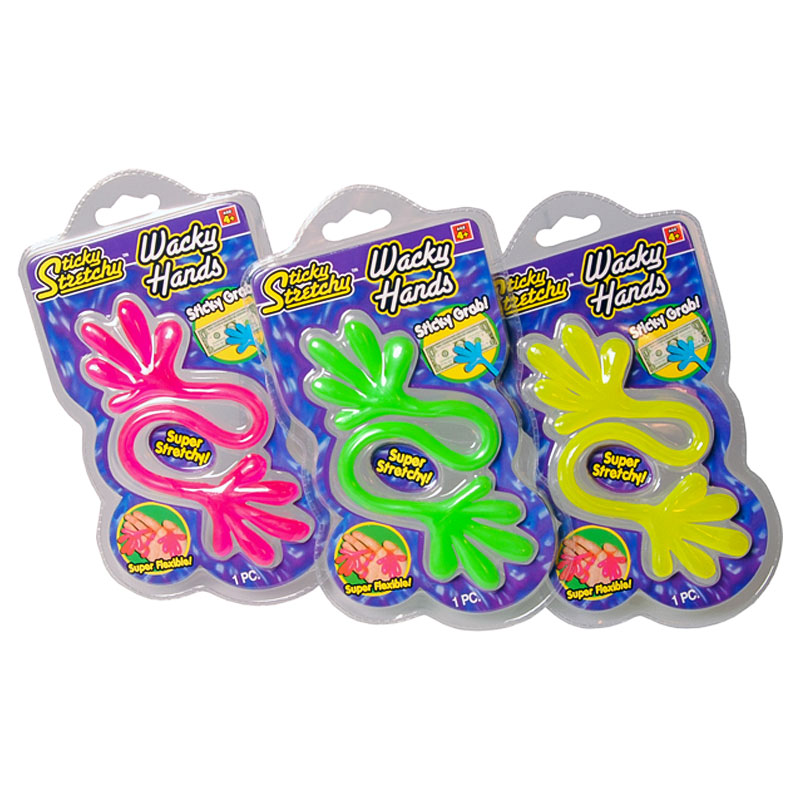 Klibbig Hand Leksak omfattar en lång, klibbig och stretchig handleksak av slime-liknande material. Handen kan kastas och fastna på flera olika hårda ytor, som exempelvis väggar, dörrar, glas, speglar m.m. Finns i flera olika färger, vilken färg du får blir en överraskning.
