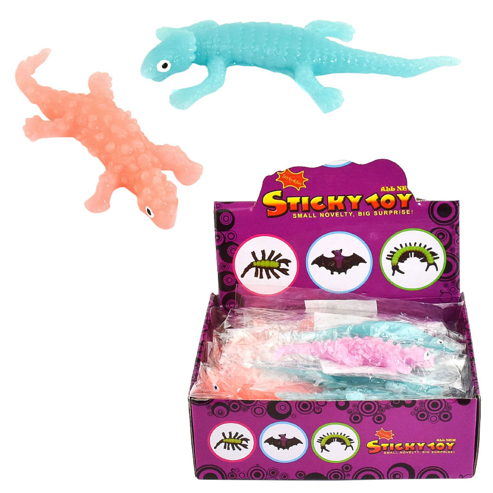 Klibbig Ödla Leksak omfattar en klibbig och stretchig leksaksödla av slime-liknande material. Ödlan är ca 18 cm stor och finns i flera olika färger, vilken färg du får slumpas.