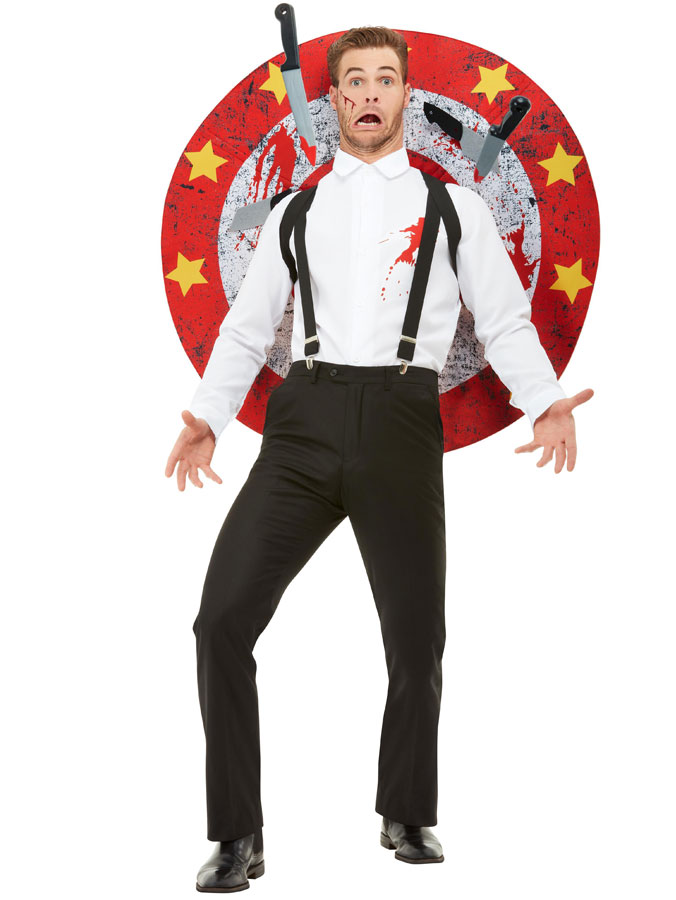 Har du någonsin känt dig som en vandrande måltavla för alla typer av grejer som frukt, tomater eller kanske till och med knivar? Med denna dräkt så kan du få den pricktavlan du känt av och förhoppningsvis så blir det den man träffar istället för dig! Dessa kläder passar perfekt till en cirkus maskerad eller till och med halloween med lite skärsår och blod för att verkligen ge av en riskabel look.