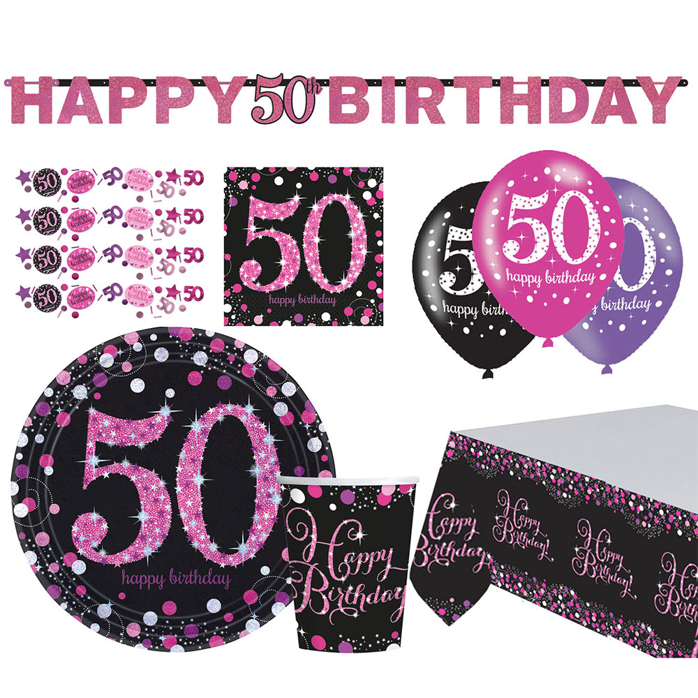 Komplett Födelsedagsset 50 år omfattar ett födelsedagsset i svart, lila, rosa och vitt med 50-årstema.