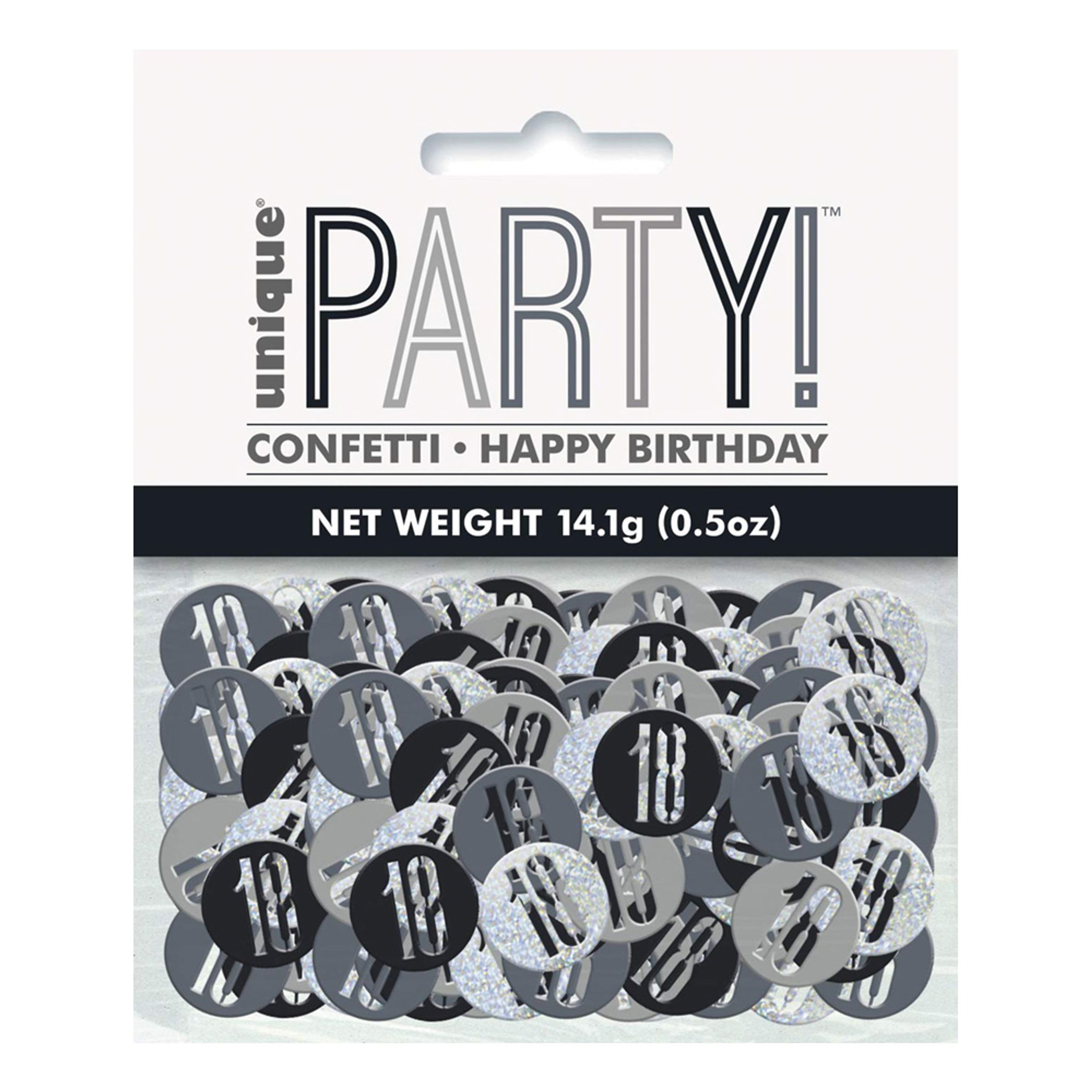 Konfetti 18 Svart/Silver innehåller 14 g svart och silverfärgad konfetti med siffran 18 utskuren på varje konfetti. Konfettin är tillverkad i folie.