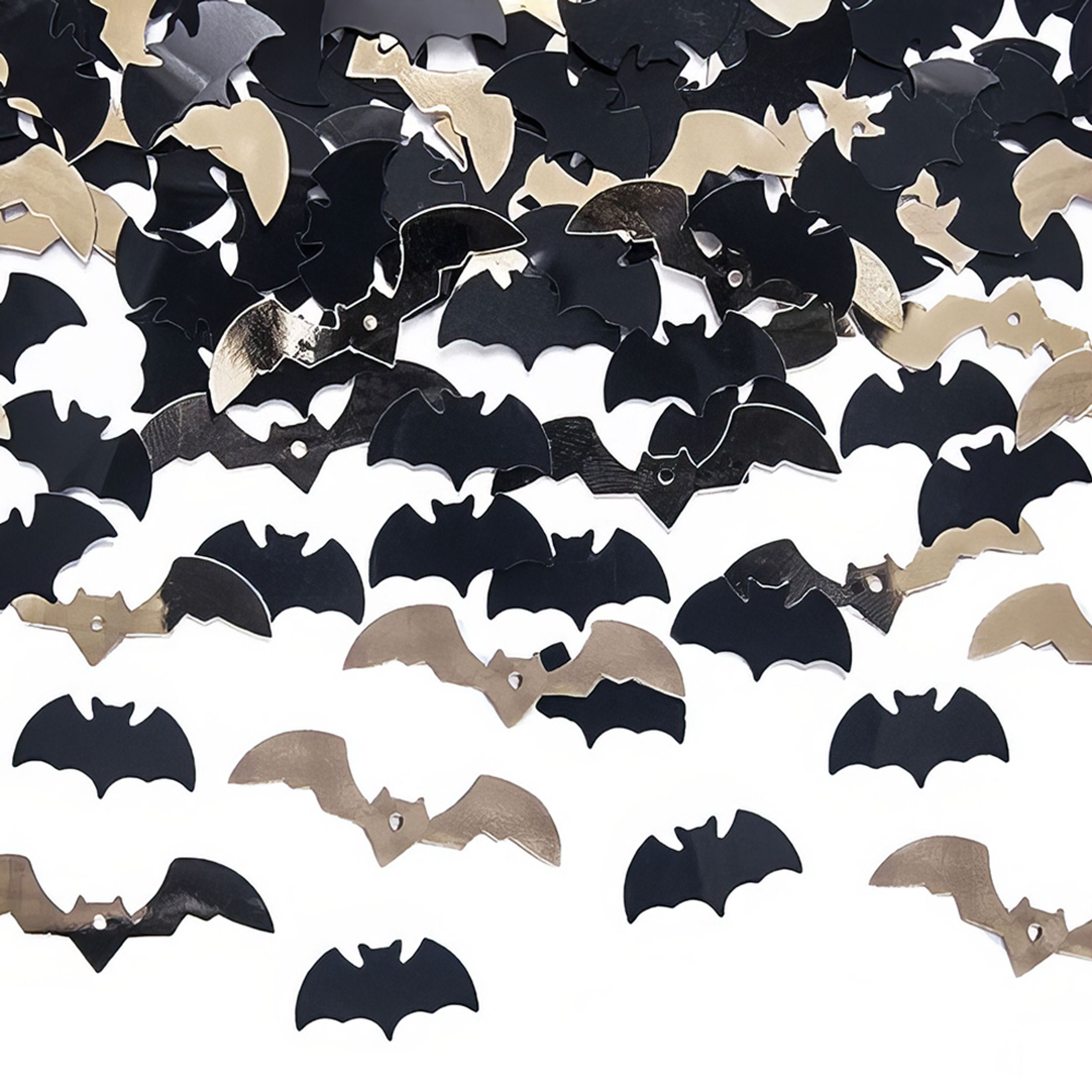 Häftig konfetti i form av svarta och guldfärgade fladdermöss i metallicmaterial. Varje konfetti mäter 17 mm respektive 25 mm stora.