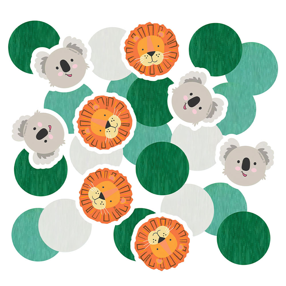 Konfetti Get Wild omfattar 14 gram konfettimix med rund konfetti i vitt och grönt samt konfetti i form av lejon och koalor. Tillverkad av papp.