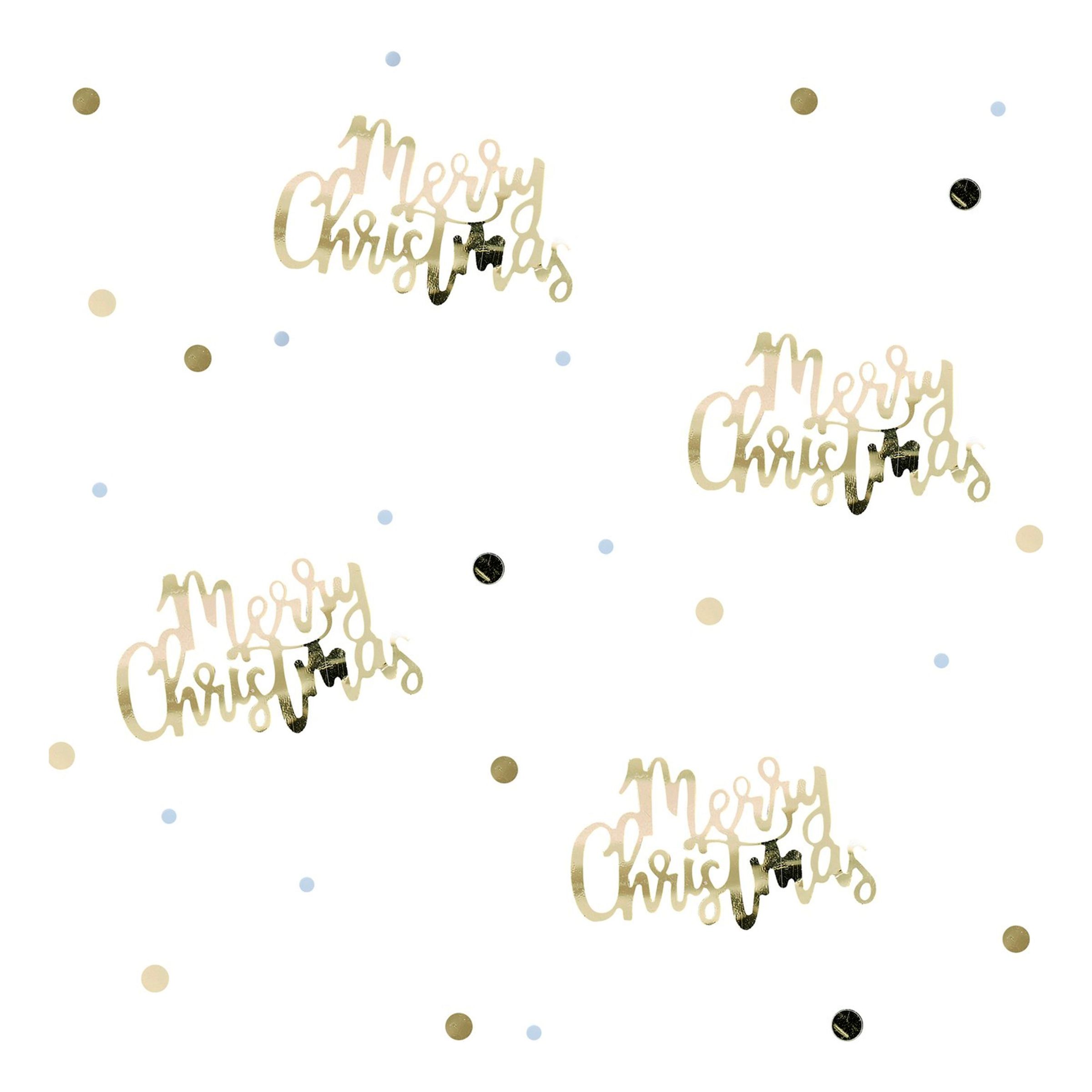 Konfetti Guld Merry Christmas innehåller ett dekorativt bordskonfetti med texten "Merry Christmas" som passar utmärkt att sprida över ett dukat bord eller att lägga i presentpåsar av cellofan med julklapp i.