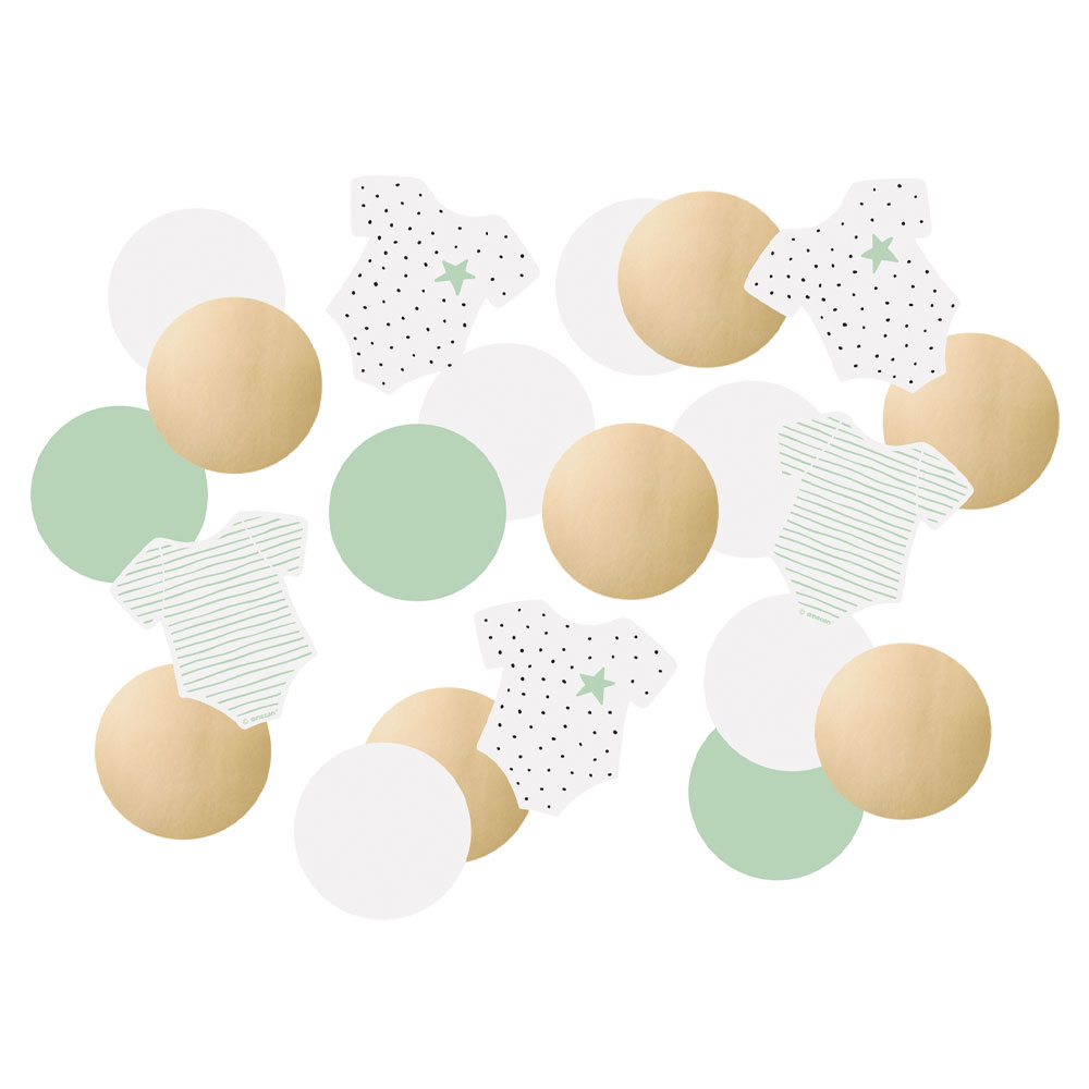 Konfetti Hello Baby omfattar konfetti med Hello Baby tema. Konfettin består av cirklar i guldfolie och mintgrönt papper samt små bebisbodies i vit papp med mintgröna och svarta detaljer. Konfettin kommer i påse om 14 gram.