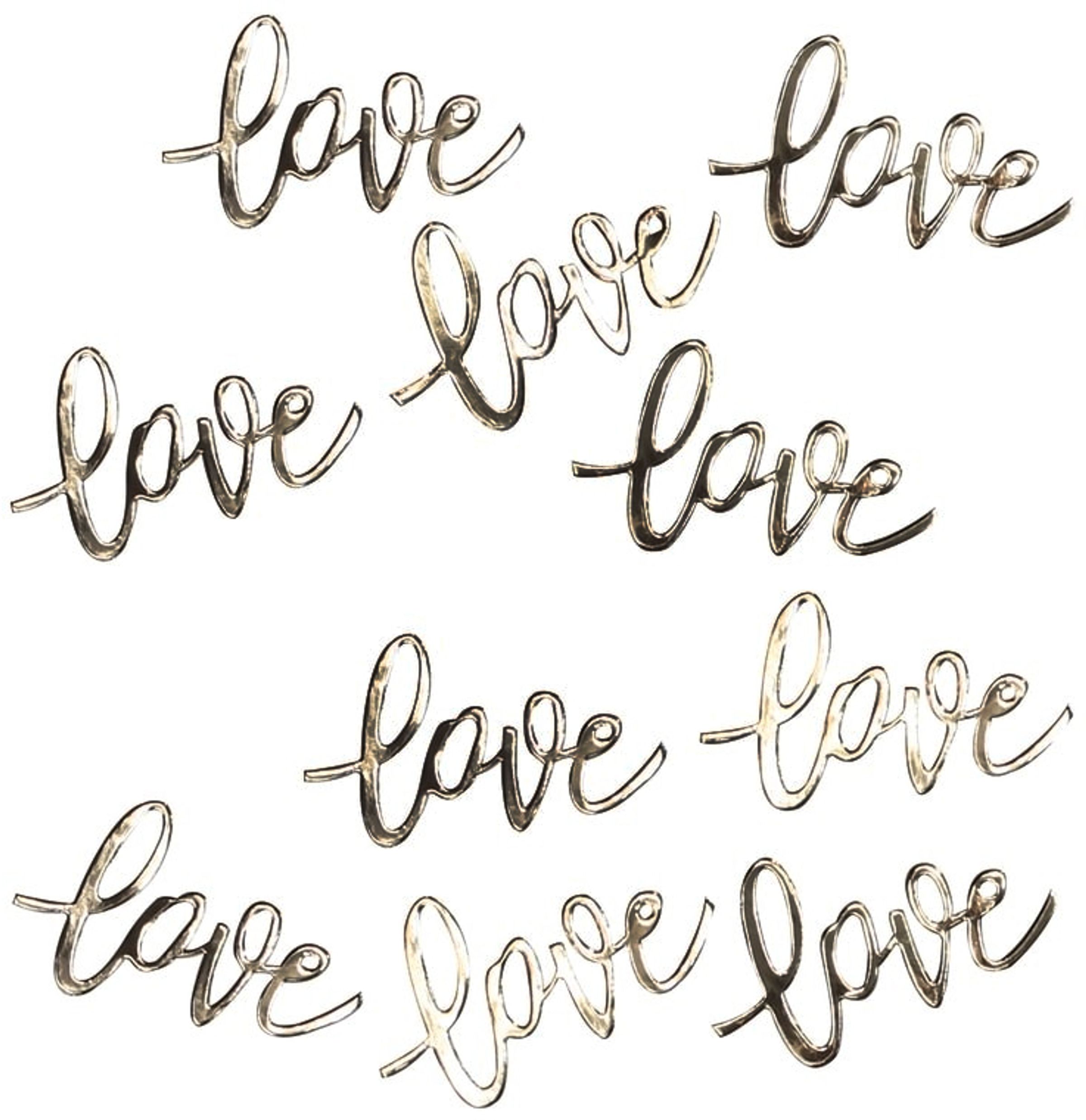 Konfetti Love Guld Metallic innehåller en påse med 14 g konfetti i papp. Varje konfetti består av texten "Love" och kommer med en skimrande folieyta i metallic guld.