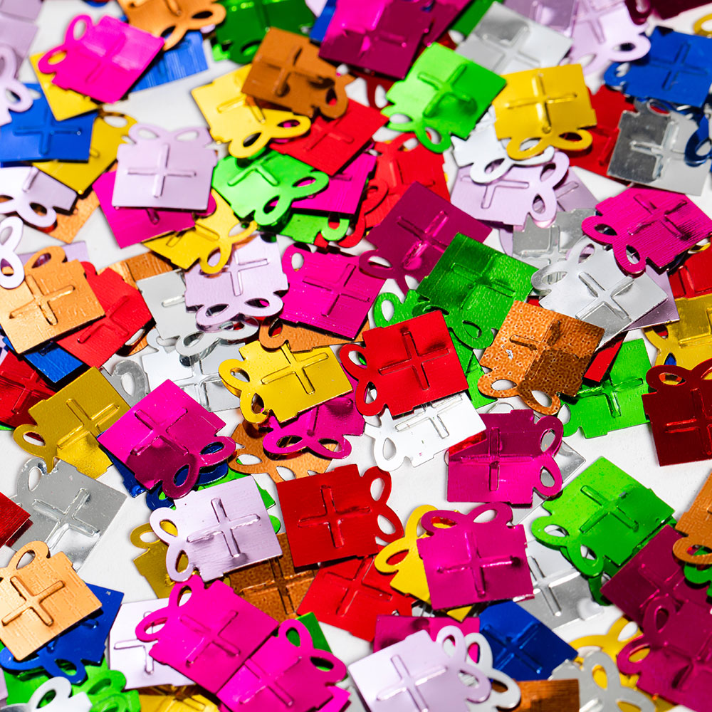 – Konfetti i form av paket i olika färger.