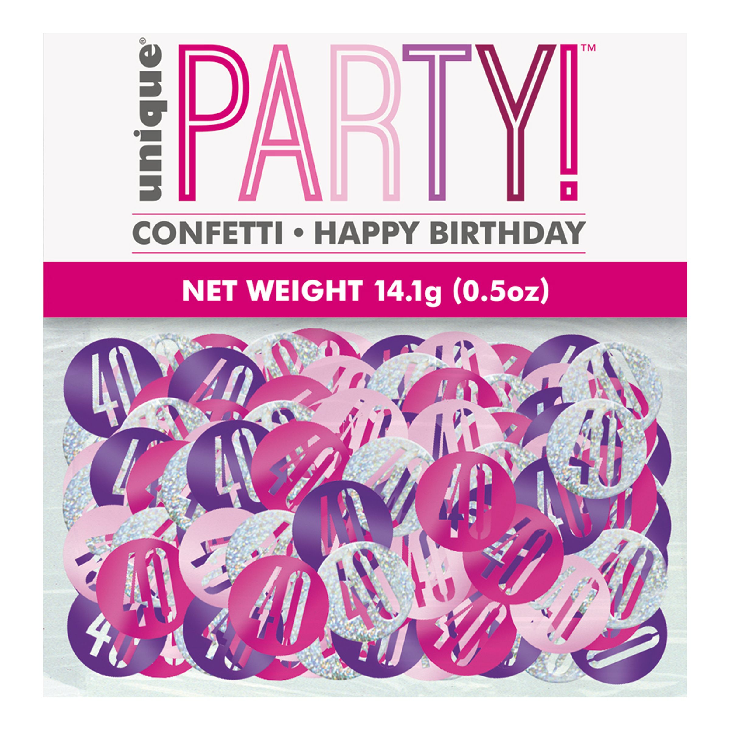 Konfetti Rosa 40 kommer i ett pack med 14 grams konfetti. De kommer i färgerna lila, rosa och silverglitter. De är producerade i folie och passar alltså utmärkt på födelsedagsfesten. Texten säger 40 och då syftar den på 40 år.