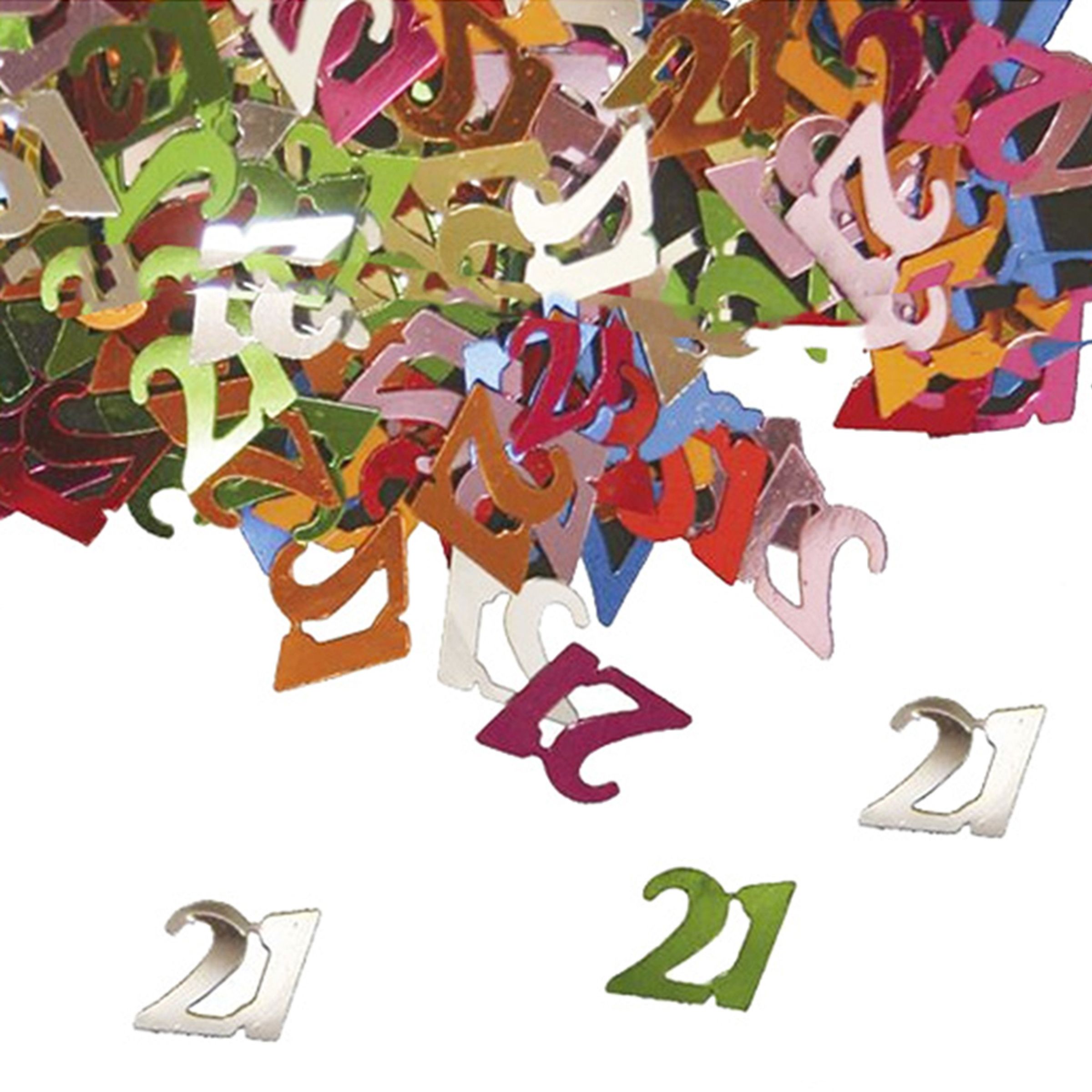 Konfettin är av skimrande metallic i olika glada färger i form av siffran 21.