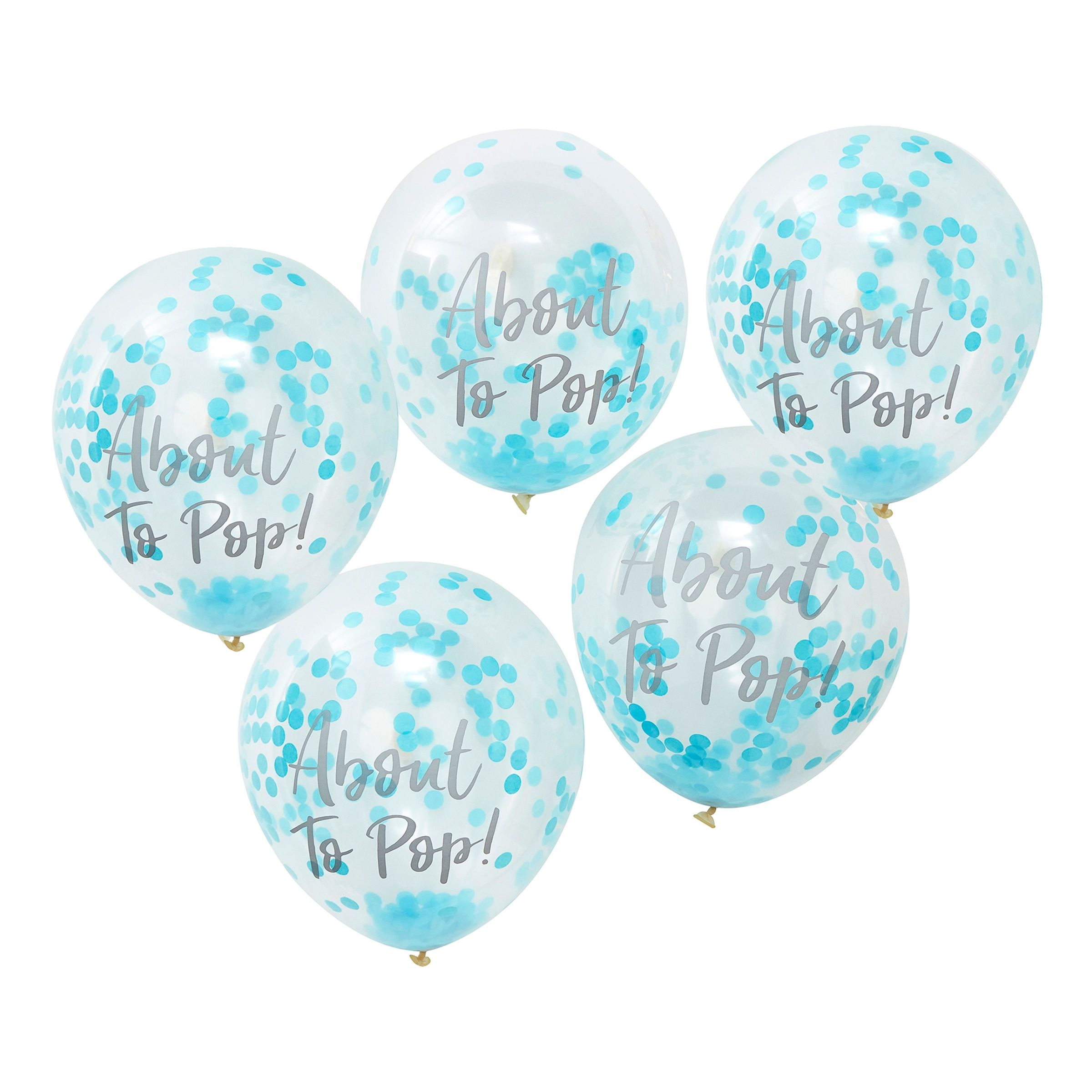 Konfettiballonger About To Pop Ljusblå kommer i en förpackning med fem stycken transparenta ballonger med ljusblå konfetti. På ballongerna står det "About to pop". Ballongerna är 30,5 cm i diameter och kan fyllas med helium eller luft.