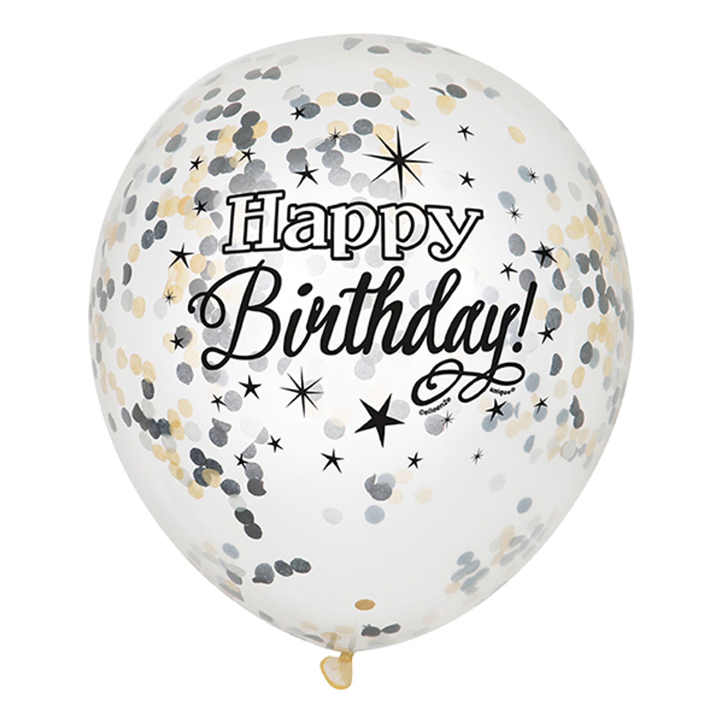 Konfettiballonger Glitter Happy Birthday är ett 6-pack ballonger du själv fyller med konfetti (konfettit ingår). Dessa går i färgerna silver, vitt och guld. På ballongen står "Happy Birthday" i olika typsnitt och runt om sitter små stjärnor.