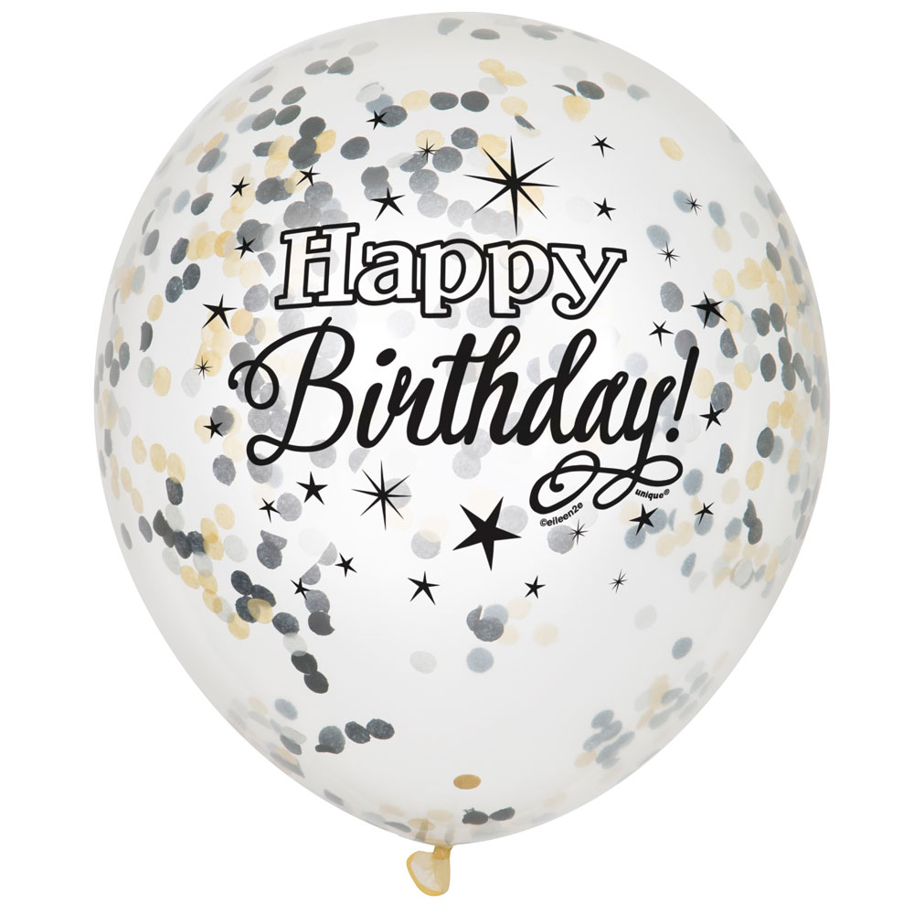 Konfettiballonger Happy Birthday Svart består av 6 stycken genomskinliga ballonger och en påse konfetti i färgerna svart, silver och guld, samt en liten tratt i papp. Ballongerna har en festlig "Happy Birthday" text i svart med dekorativa stjärnor. Med hjälp av den lilla tratten kan du enkelt fylla ballongerna med konfetti innan du blåser upp dem med luft eller helium.