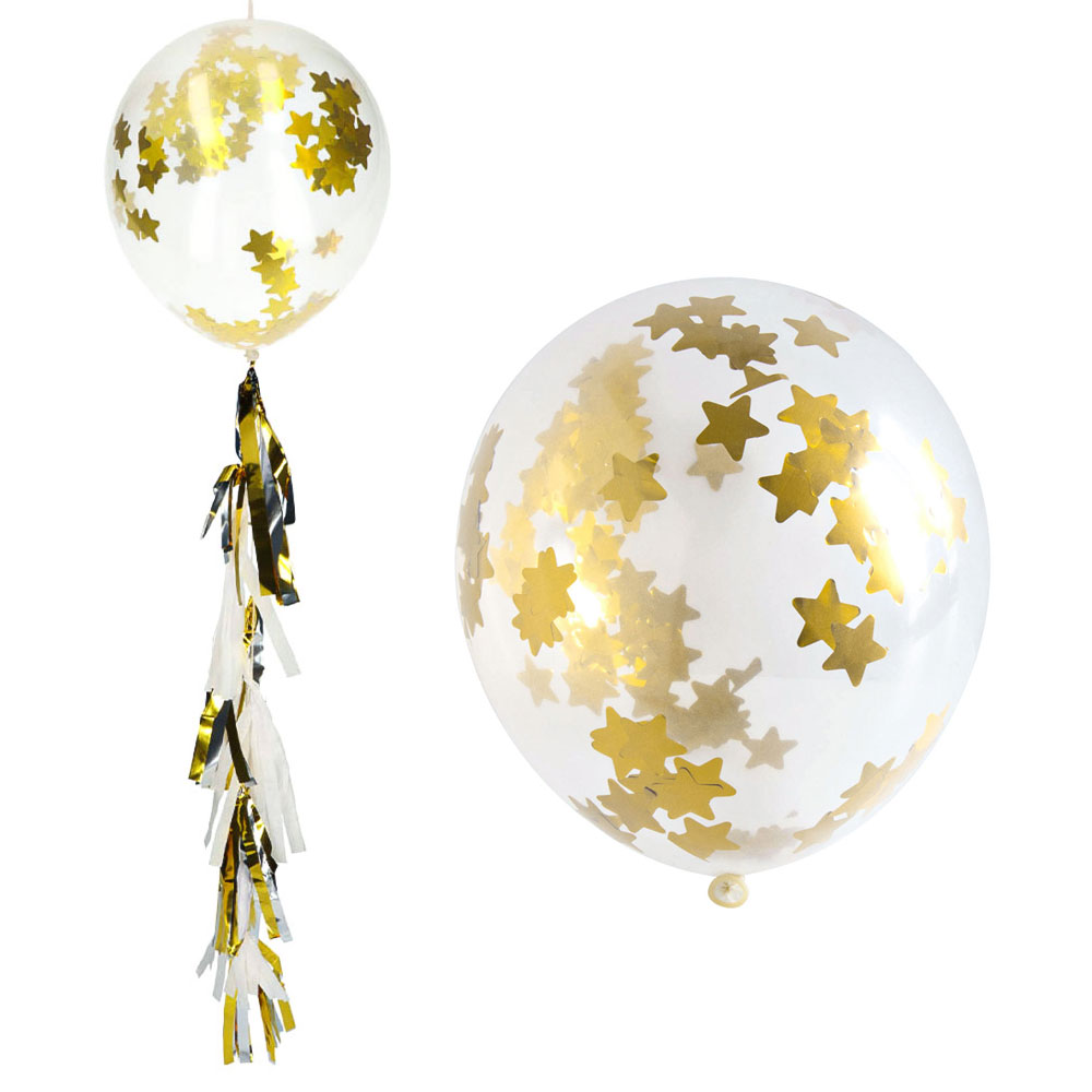 Festligt guldiga konfettiballonger med stjärnformad konfetti och dekorativa tofsar som utan tvekan blir en fantastisk ballongdekoration till flera olika fester och kalas! Med dessa genomskinliga latexballonger kan du alltså enkelt skapa ett riktigt stämningsfullt firande på nolltid. Utmärkta konfettiballonger till firanden som exempelvis nyårsafton och andra firanden i guld.