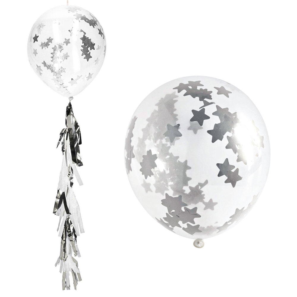 Med ett gäng konfettiballonger som dessa kan du enkelt pynta festen som ett riktigt party-proffs! Tre stycken genomskinliga latexballonger med silvrig stjärn-konfetti och fina dekorationstofsar i vitt och silver som garanterat blir en riktigt imponerande ballongdekoration till vilken fest eller kalas som helst. Perfekta konfettiballonger för alla som vill pynta firandet på ett enkelt och riktigt effektfullt sätt!