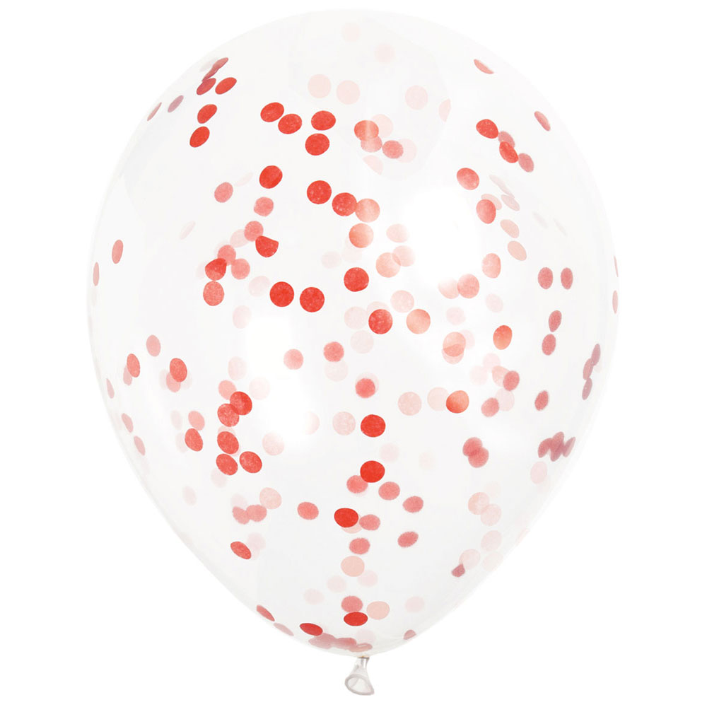 Konfettiballonger Röd består av genomskinliga ballonger, en påse röd konfetti och en papp-tratt som gör det lättare att hälla ner konfettin i ballongerna. Blås upp ballongerna med helium eller luft.
