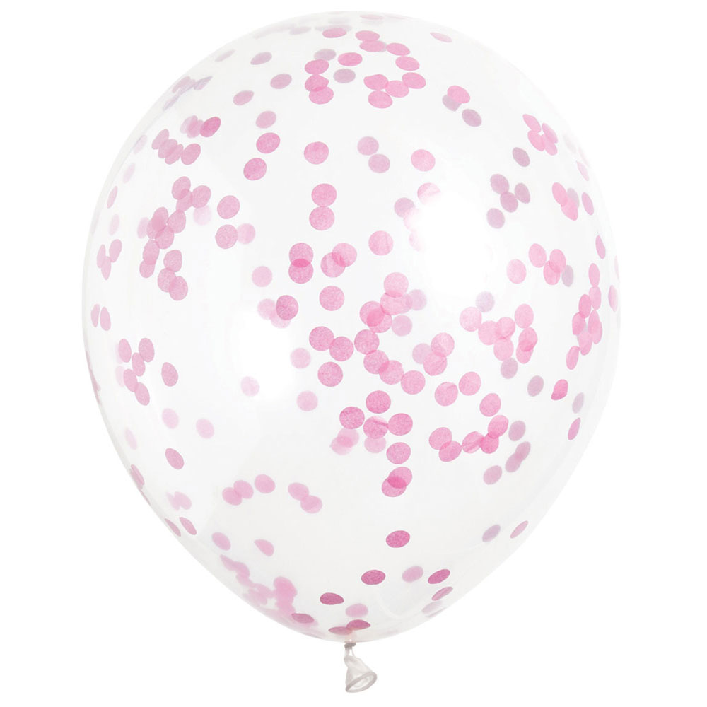 Konfettiballonger Rosa består av ett 6-pack genomskinliga ballonger, en påse rosa konfetti och en papp-tratt som gör det enklare att fylla ballongerna med konfetti. Blås upp ballongerna med helium eller luft.
