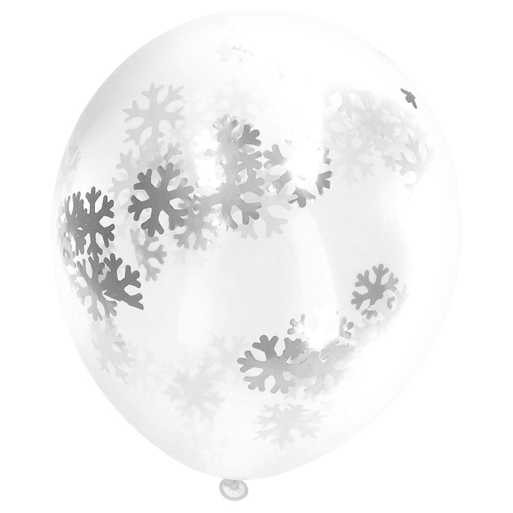 Konfettiballonger Snöflingor består av 4 stycken genomskinliga latexballonger med silvrig konfetti i form av snöflingor. Ballongerna fylls med luft eller helium och blir ca 30 cm stora.