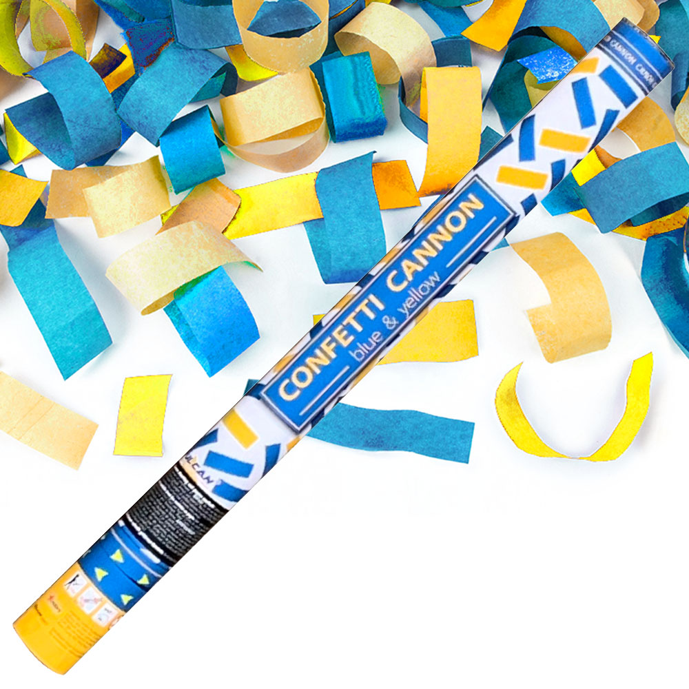 Konfettikanon Blå & Gul 60 cm omfattar en lång konfettikanon som skjuter ut rektangulära papperskonfetti i blått och gult, när kanonens nedre del vrids på.