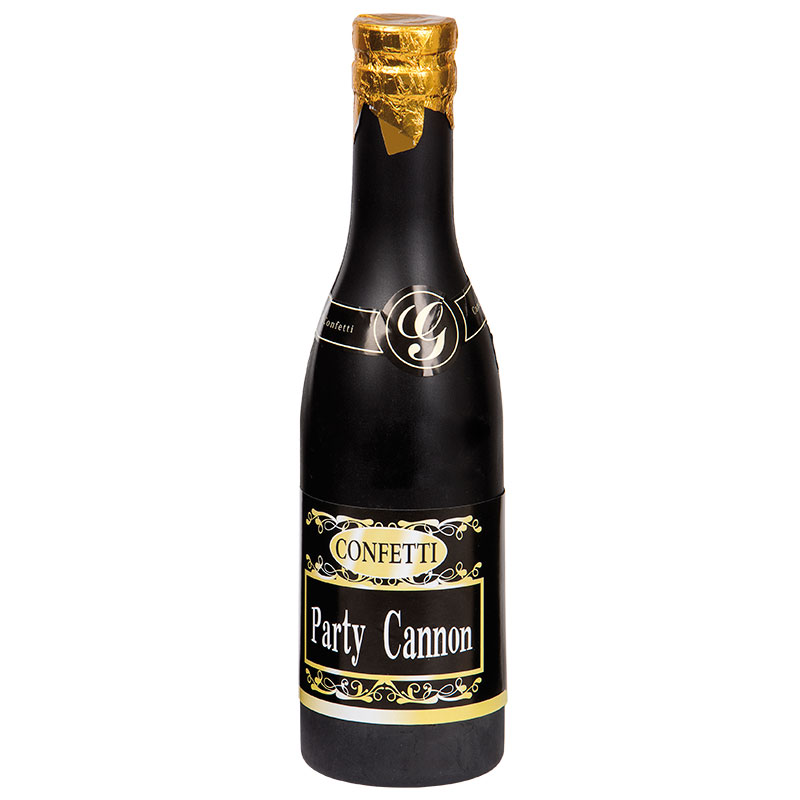 Konfettikanon Champagneflaska består av en konfettikanon i form av en champagneflaska. Kanonen är ca 33 cm hög och skjuter ut konfetti i papp och folie. Konfettikanonen aktiveras enkelt genom att vrida nederdelen åt motsatt håll.