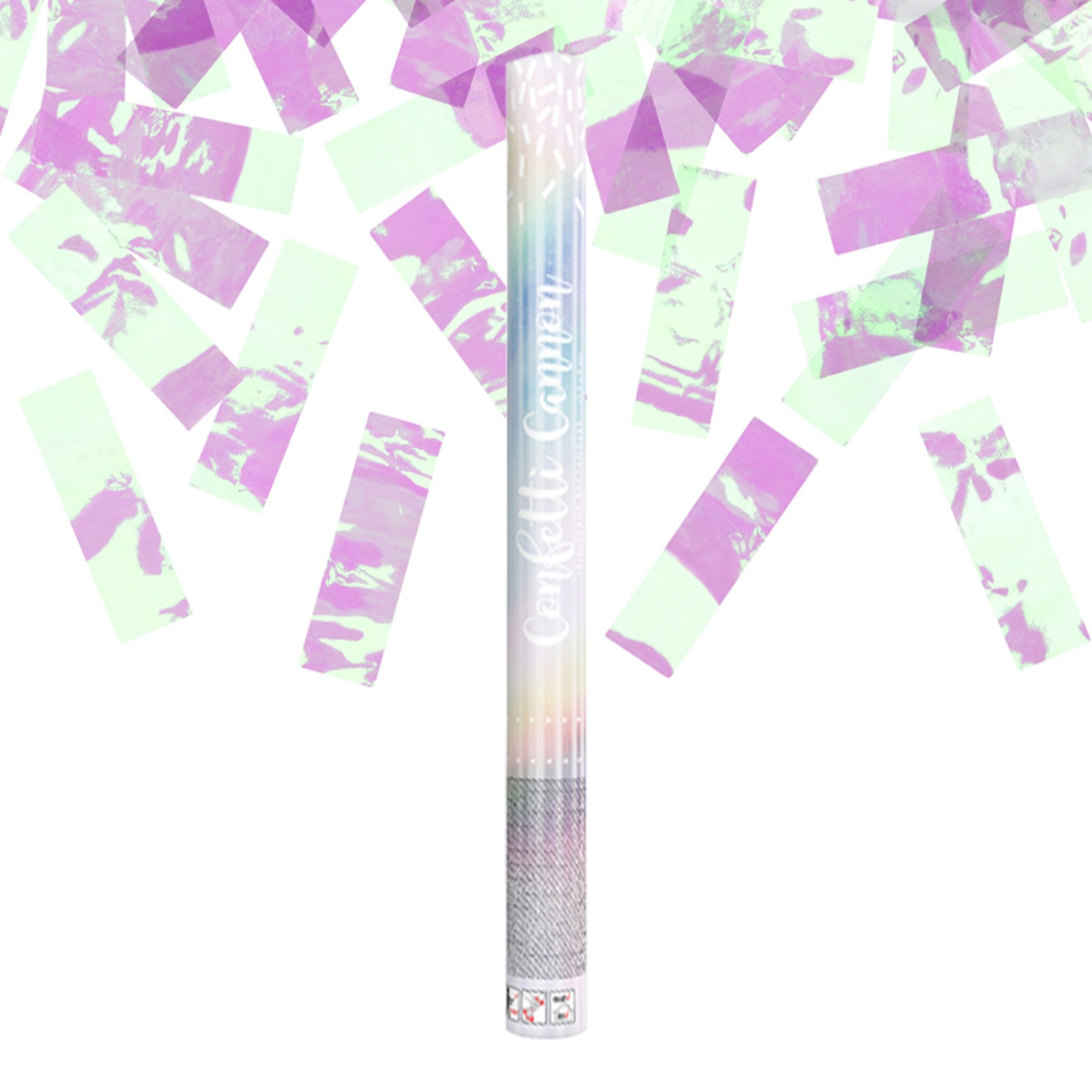 Konfettikanon Färgskimrande är ett rör på 60 cm som skjuter ut färgskimrande konfetti när du vrider om botten på kanonen. Instruktioner på engelska på förpackningen.