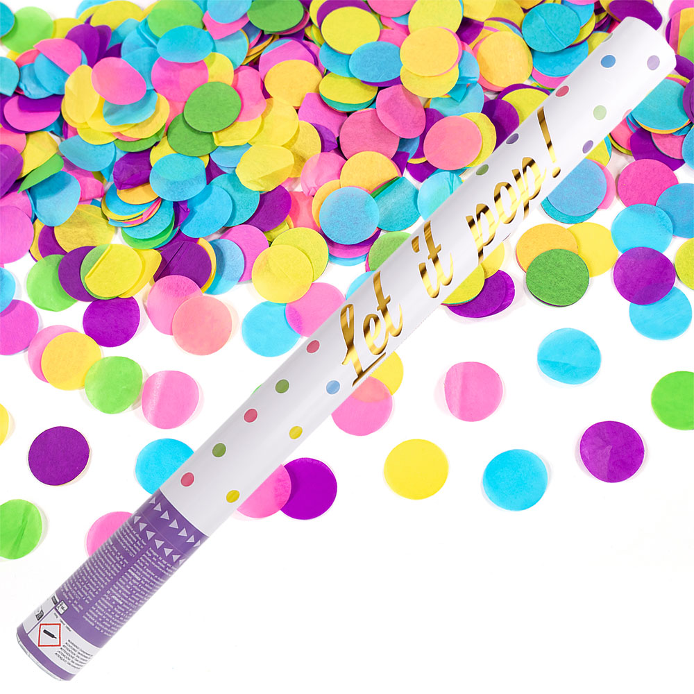 Konfettikanon Flerfärgad 60 cm omfattar en 60 cm lång konfettikanon med rund och flerfärgad konfetti som konfettikanon skjuter ut med ett kraftigt lufttryck när man vrider på botten. Instruktioner finns på förpackningen.